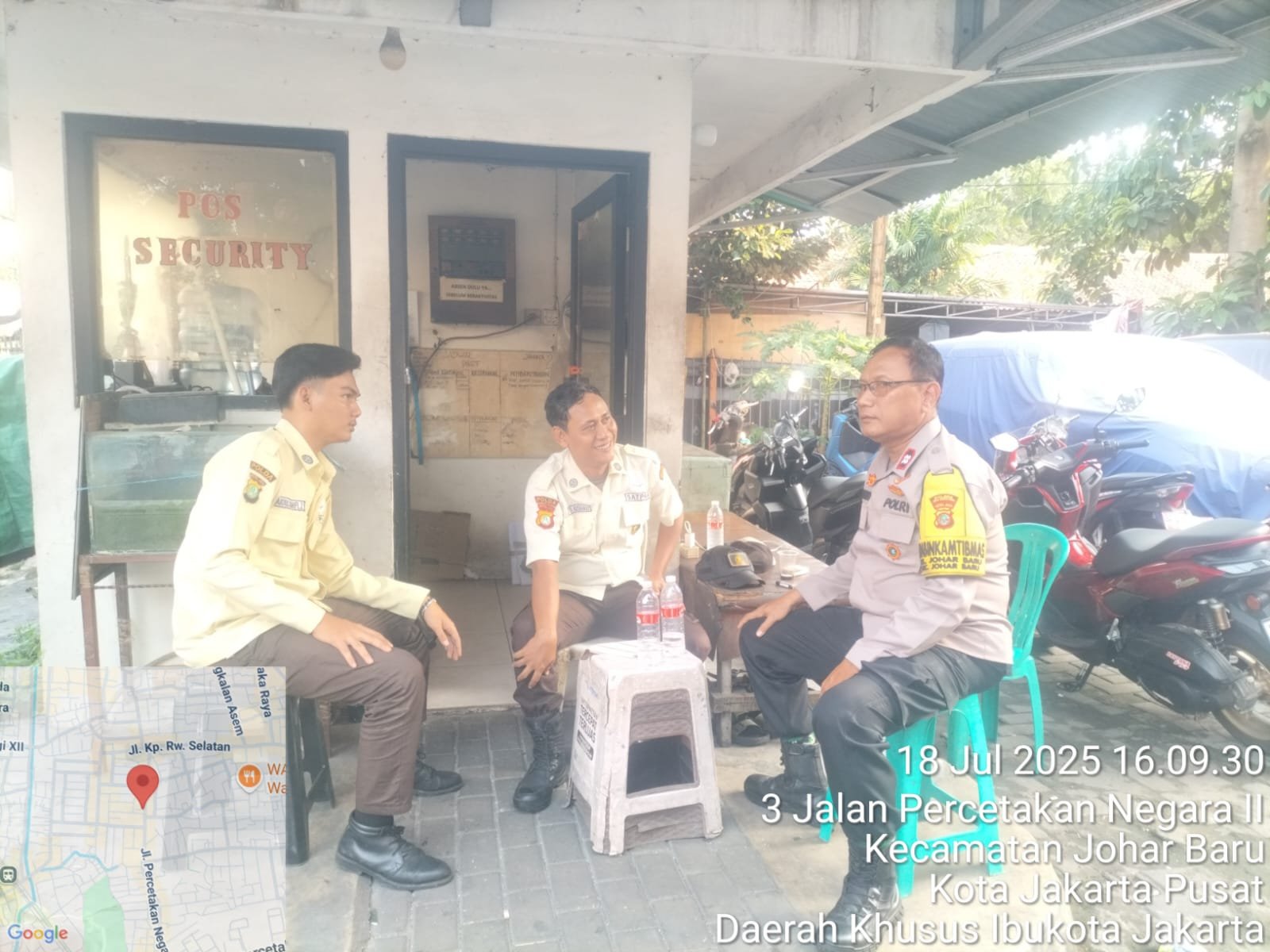 refubliknews.com, || Jakarta Pusat — Dalam rangka menjaga keamanan wilayah dan membangun sinergi dengan petugas keamanan swasta, Bhabinkamtibmas Kelurahan Johar Baru Aiptu Sunarto melaksanakan kegiatan patroli dialogis dan cooling system di Gedung UKM RW 10, Jalan Percetakan Negara II, Kelurahan Johar Baru, Jakarta Pusat, pada Sabtu (19/7/2025) pukul 12.30 WIB.