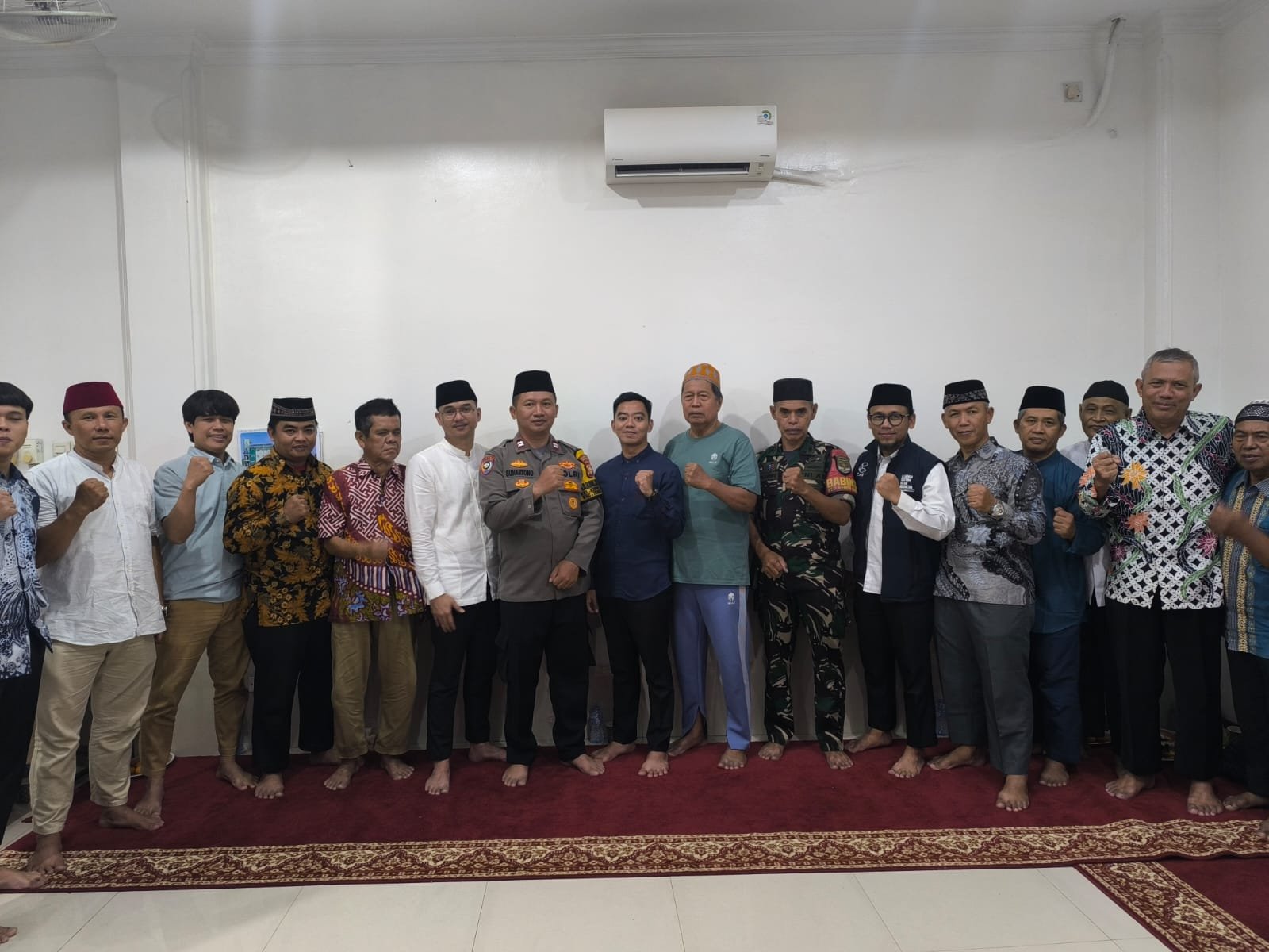 Suasana penuh hangat saat berbuka puasa antara tiga pilar dengan tokoh agama dan masyarakat. Selanjutnya dilanjutkan sholat Maghrib Berjemaah.