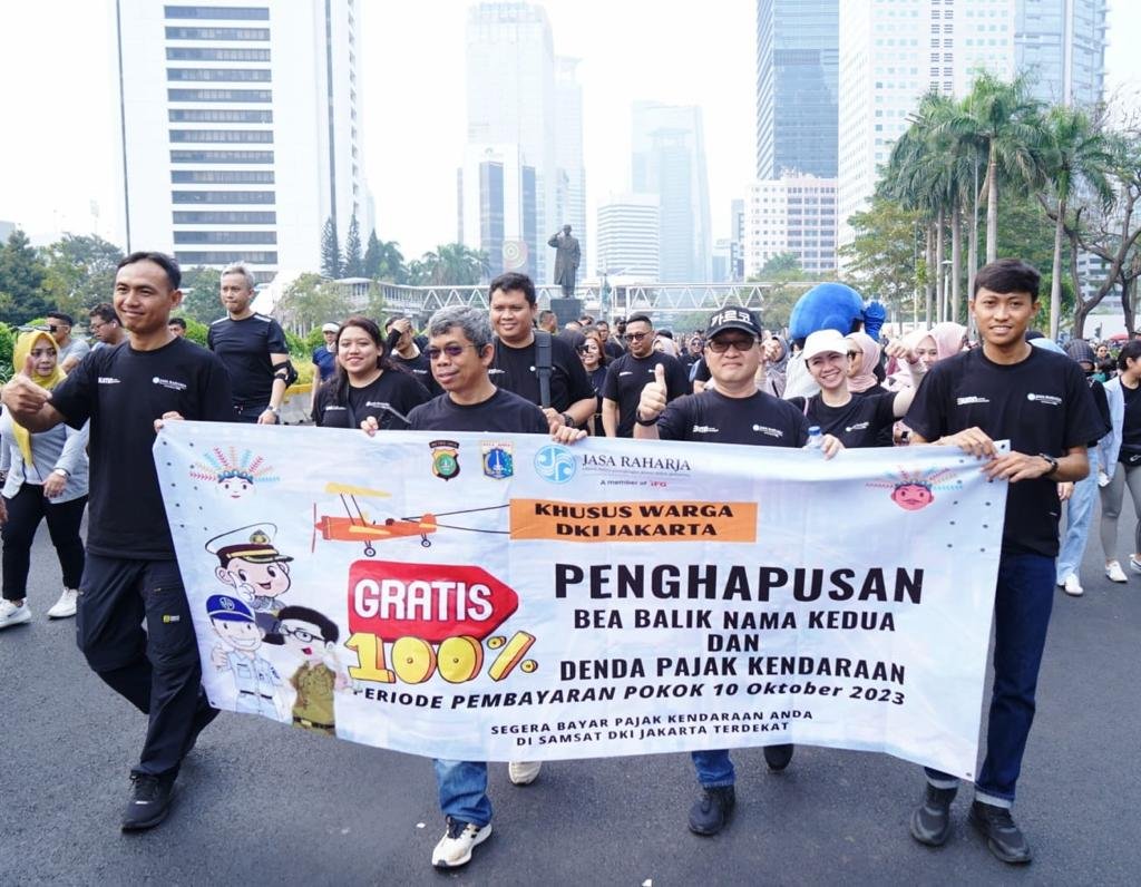 Lebih dari itu insan Jasa Raharja juga melaksanakan gerak jalan bersama dengan menginformasikan mengenai pembebasan denda pajak kendaraan bermotor dan pembebasan biaya balik nama.