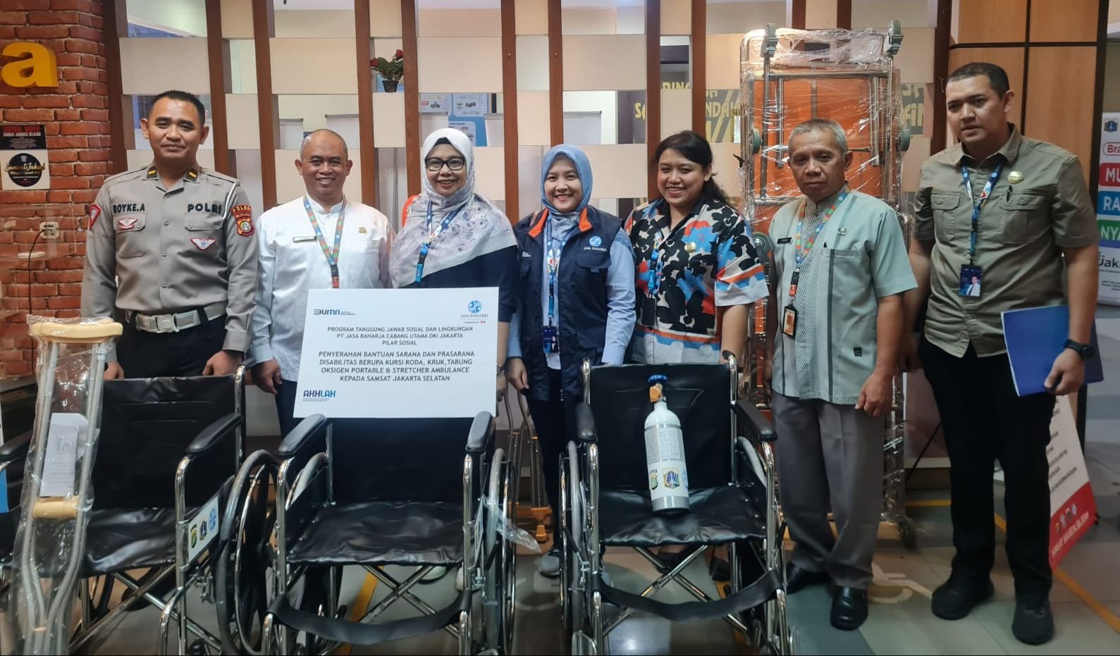 Jumat tanggal 29 September 2023 PT Jasa Raharja Cabang Utama DKI Jakarta melaksanakan Penyerahan Bantuan TJSL Sarana dan Prasarana Disabilitas berupa Kursi Roda, Kruck, Oksigen Portable dan Strecther Ambulance ke Samsat Jakarta Selatan diserahkan secara simbolis oleh Kepala Jasa Raharja Cabang Utama DKI Jakarta, Suhadi, yang didampingi oleh Kepala Bagian Operasional, Risanto Simamora, Kepala Bagian Administrasi, RA Wulandari Esti Rizkiwati, Kepala Jasa Raharja Perwakilan Jakarta Selatan, Ita Novita dan Kepala Sub Bagian Keuangan, Akutansi dan TJSL, Wina Sa’ichoiriyah yang diterima langsung oleh Kepala Unit Pelayanan Pemungutan PKB Kota Admimistrasi Jakarta Selatan yang diwakili oleh Heri Pudji Trisilo, serta Kepala Unit STNK Samsat Jakarta Selatan yang diwakili, Ipda Royke Yuliyana Adesta.