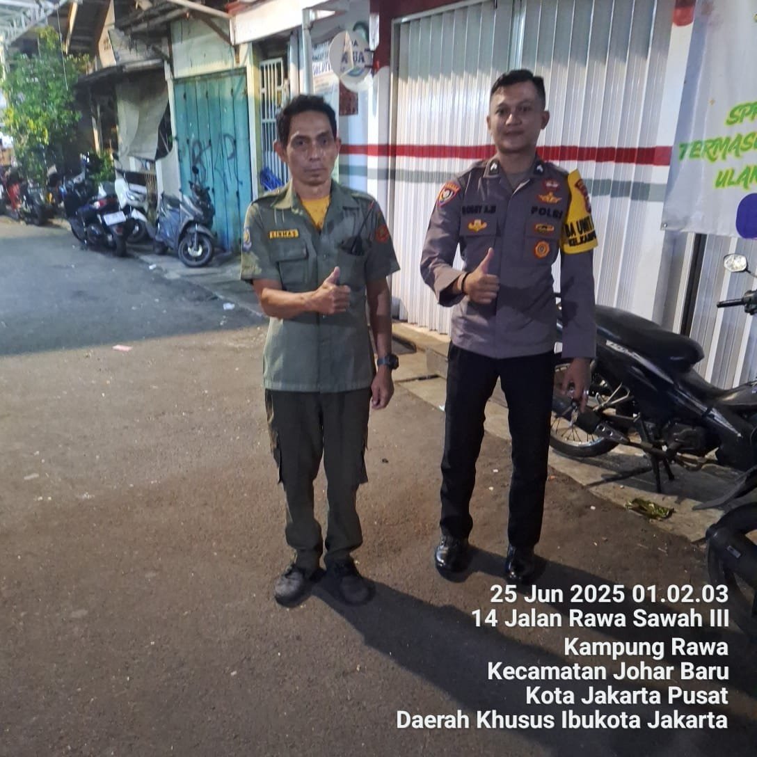 refubliknews.com, || Jakarta Pusat — Menjelang peringatan Hari Bhayangkara ke-79, jajaran kepolisian sektor Johar Baru semakin mengintensifkan pendekatan kepada masyarakat dalam menjaga keamanan dan ketertiban lingkungan. Rabu dini hari (25/6/2025), pukul 00.45 WIB, Bripda Robby Alamsyah, Banit Pendamping Binmas Kelurahan Kampung Rawa, melaksanakan sambang ke Pos Satkamling RW 01 di Jalan Rawa Sawah 3, Kelurahan Kampung Rawa, Kecamatan Johar Baru, Jakarta Pusat.