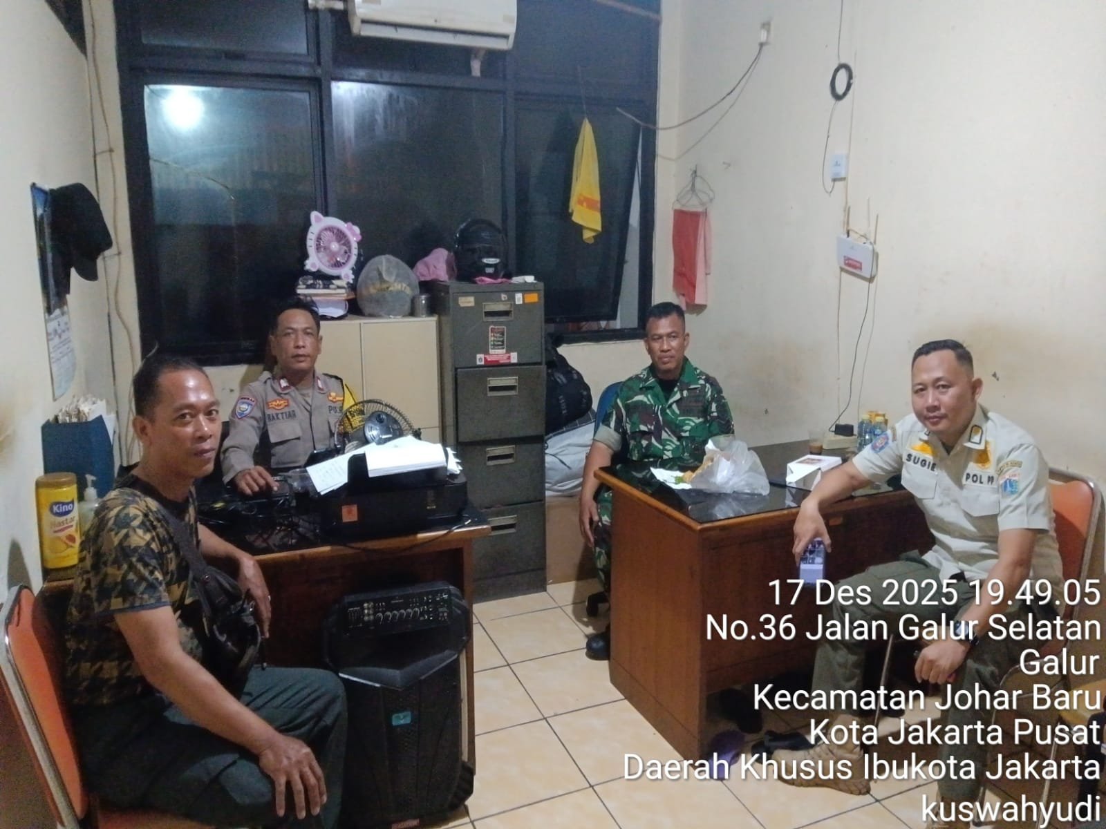 Jakarta Pusat — Dalam rangka menjaga stabilitas keamanan dan ketertiban masyarakat (kamtibmas) menjelang perayaan Natal dan Tahun Baru (Nataru) 2026, Bhabinkamtibmas Kelurahan Galur bersama unsur Tiga Pilar dan Forum Kewaspadaan Dini Masyarakat (FKDM) menggelar kegiatan koordinasi kamtibmas, Rabu (17/12/2025) malam.