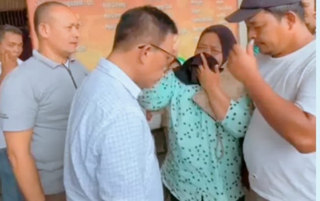Mega Boru Hutabarat, ibunda dari Raju Firmanda Hutagalung, tak kuasa menahan tangisnya saat Paslon Masinton Pasaribu-Mahmud Effendi Lubis mengunjungi kediamannya di Lingkungan IV, Kelurahan Sibuluan Nalambok, yang secara sengaja dibakar orang tak dikenal (OTK), pada Kamis 10 Oktober 2024, sekira Pukul 03.00 WIB dini hari.