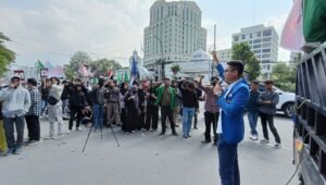 Sumatera Utara, Walau panas terik matahari tidak mengundurkan niat ratusan Mahasiswa yang tergabung pada Cipayung Plus Sumatera Utara (Sumut) menggelar deklarasi dukung pemilu damai 2024, didepan Kantor Pos Medan, Jalan Bukit Barisan, Kesawan, Kecamatan Medan Barat, Kota Medan, Sumatera Utara, Kamis (08/02/2024) siang.