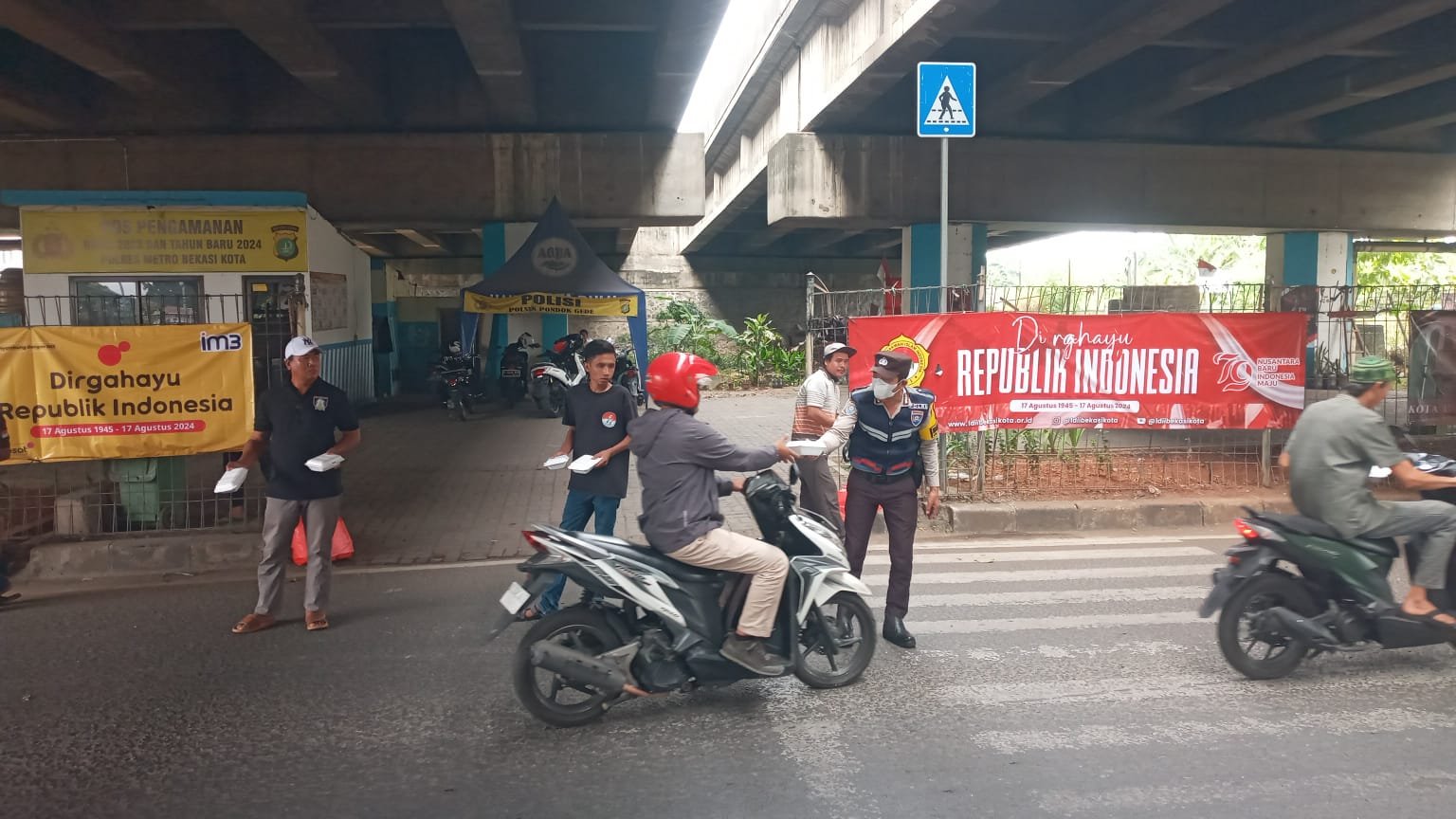 Kegiatan yang berlangsung pukul 13.00 WIB hingga selesai ini berupa pembagian 150 nasi kotak kepada para pengguna jalan yang melintas di sekitar Pos Lalu Lintas Bundaran JORR Jl. Ry Hankam RT 004/009 Kelurahan Jatiwarna, Kecamatan Pondok Melati.