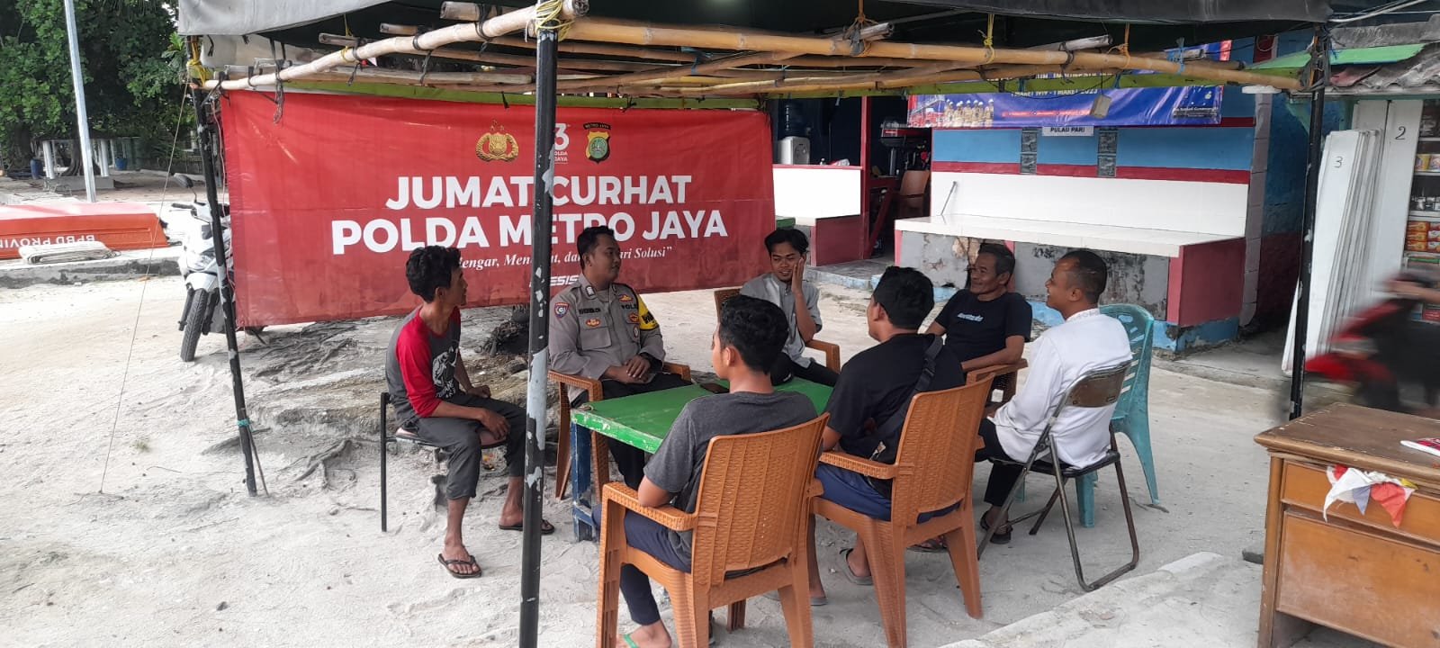 Jakarta – Bhabinkamtibmas Pulau Pari, Polsek Kepulauan Seribu Selatan, Polres Kepulauan Seribu Bripka Khohim Chovivi melaksanakan kegiatan pelayanan yang bertajuk Jumat Curhat dan silaturahmi yang dihadiri oleh tokoh agama dan tokoh masyarakat Pulau Pari Kepulauan Seribu Selatan, Jumat (07/04/2023).