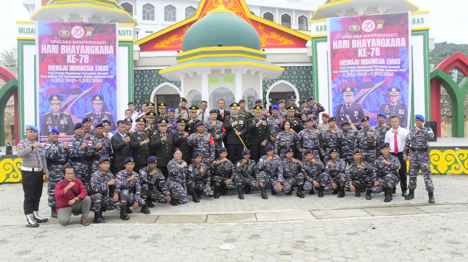refubliknews.com, – TNI AL, Kepulauan Anambas,- Dalam rangka Hari Ulang Tahun Ke-78 Bhayangkara, Komandan Lanal Tarempa Letkol Laut (P) Ari Sukmana, S.E., M.Tr. Opsla., beserta seluruh Prajurit menyerbu Astaka Masjid Agung Baitul Mamur Kepulauan Anambas tempat acara peringatan Hari Bhayangkara Ke-78, Senin (1/7/2024).