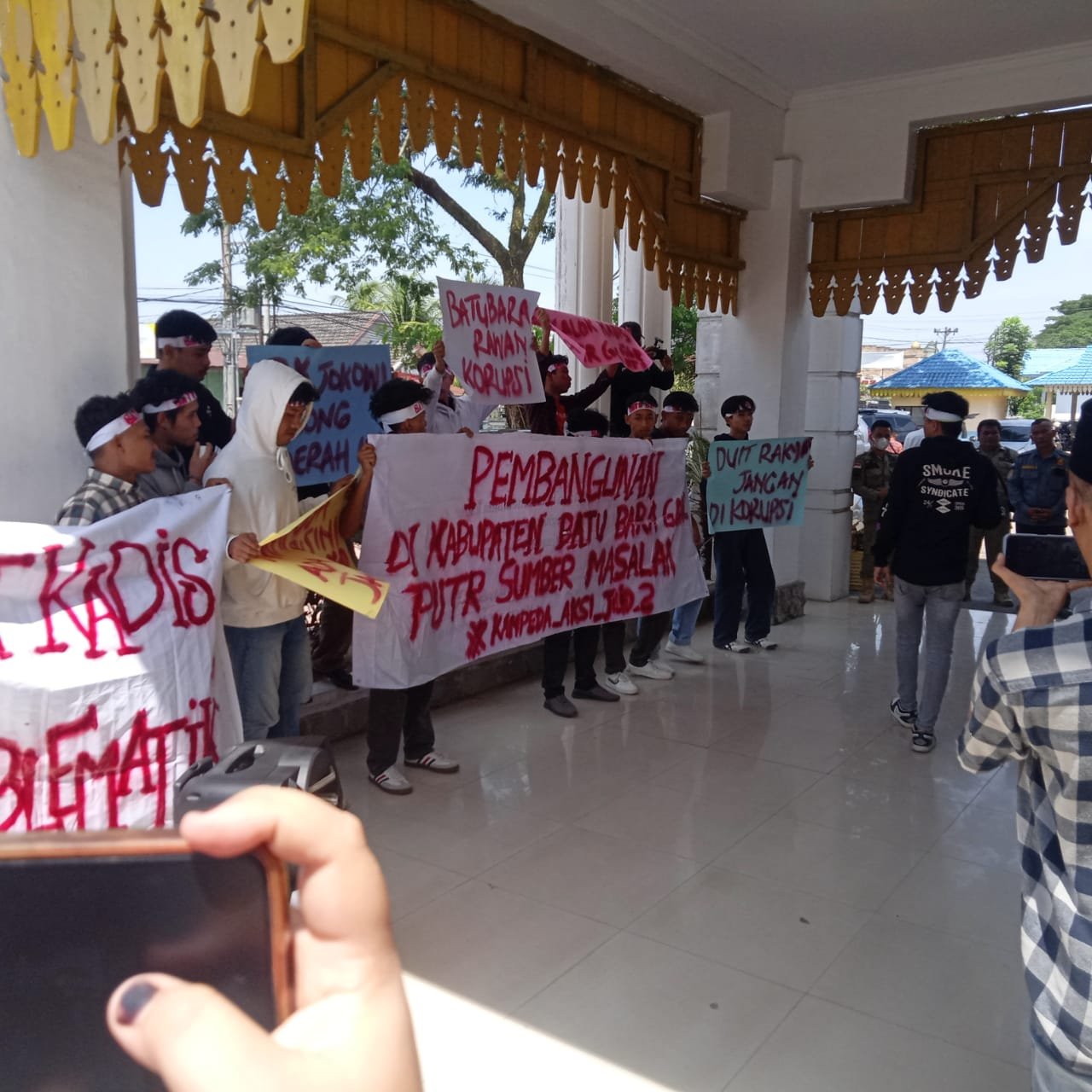 Spanduk bertuliskan, “Duit rakyat jangan dikorupsi, Batubara Rawan Korupsi, Duit Rakyat Jangan Dicuri, Dinas PUPR Batubara,”dibawa para pendemo sambil lakukan tritikal.
