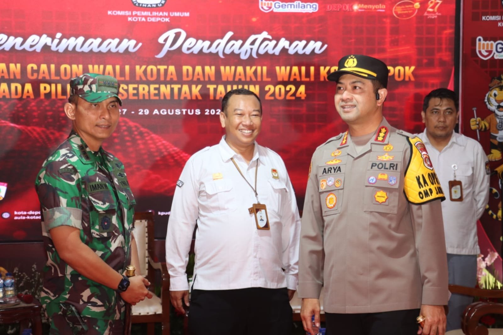 refubliknews.com, – Depok, 29 Agustus 2024 – Kapolres Metro Depok, Kombespol Arya Perdana, SH., SIK., MSi., bersama Dandim 0508/Depok Kol Inf Iman Widhiarto, turut serta dalam pengamanan jalannya proses pendaftaran paslon Walikota Depok di Kantor Komisi Pemilihan Umum (KPU) Kota Depok. Kombespol Arya Perdana yang didampingi oleh sejumlah Pejabat Utama Polres Metro Depok, memastikan bahwa pengamanan berjalan lancar dan tertib di lokasi tersebut.