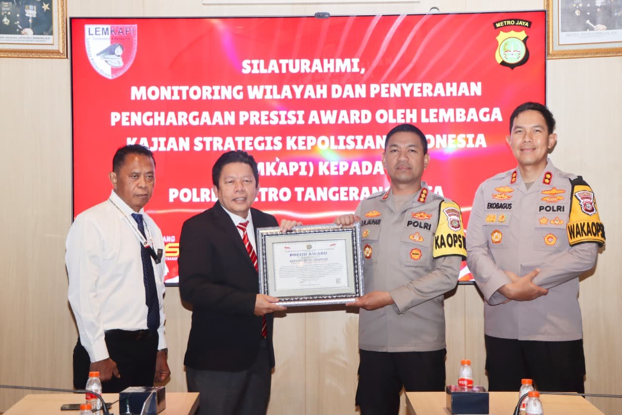 refubliknews.com, || Tangerang – (19/11/2025) Kepolisian Resor Metro Tangerang Kota menerima kunjungan silaturahmi sekaligus penganugerahan Presisi Award dari Lembaga Kajian Strategis Kepolisian Indonesia (LEMKAPI). Penghargaan tersebut diserahkan langsung oleh Direktur Eksekutif LEMKAPI DR Edi Saputra Hasibuan, SH, MH kepada Kapolres Metro Tangerang Kota Kombes Pol. Dr Raden Muhammad Jauhari, SH, SIK, MSI, pada Rabu (19/11/2025) pukul 14.00 WIB, bertempat di Rupatama Lantai 6 Gedung Presisi Polres Metro Tangerang Kota.