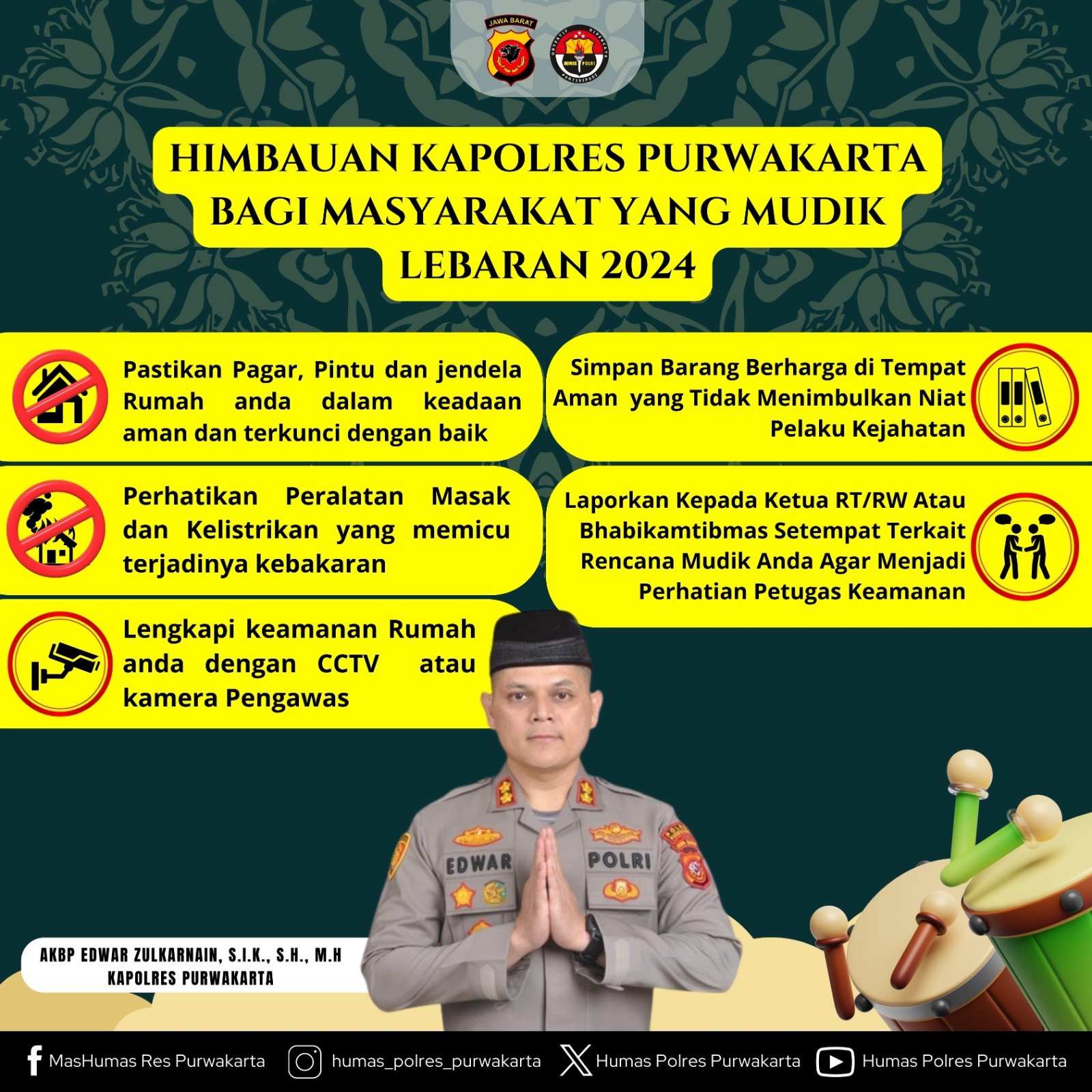 “Kami mengimbau kepada masyarakat yang merayakan lebaran dan melakukan mudik untuk memastikan kondisi keamanan rumah yang ditinggalkan,” ucap Kapolres Purwakarta, AKBP Edwar Zulkarnain,