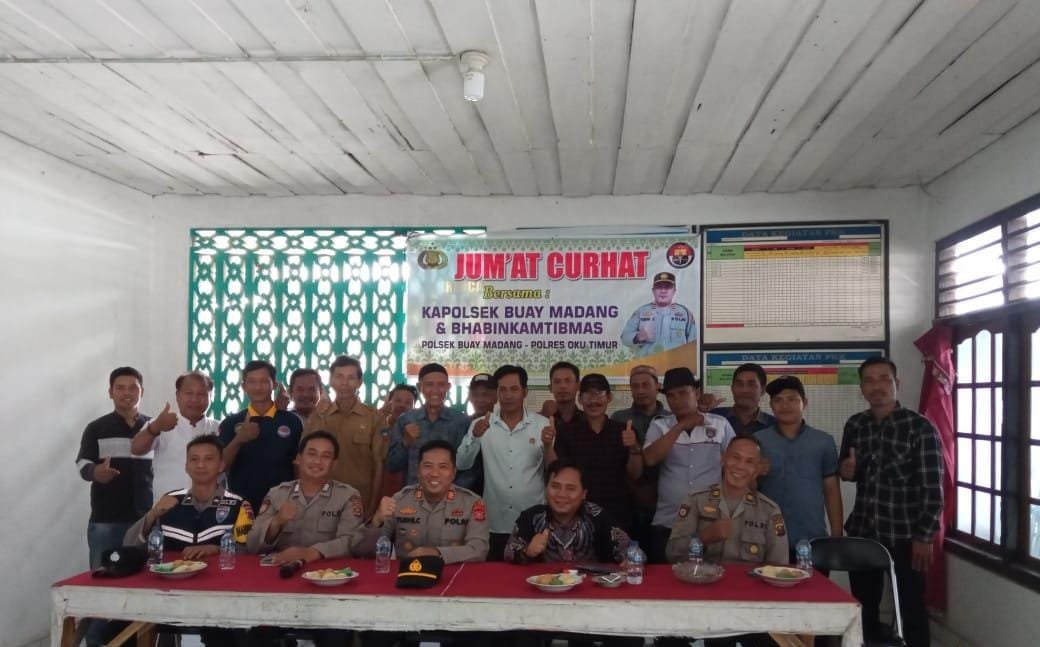 Kapolsek Buay Madang Polres Oku Timur Polda Sumsel, Akp Yudhi Cahyono pimpin giat Jum’at Curhat yang merupakan Program Prioritas Kapolri yang bertujuan untuk menyerap suara dari masyarakat secara langsung bersama Anggota. Kegiatan kali ini bertempat di Kantor Desa Kurungan Nyawa Kecamatan Buay Madang di hadiri Kepala Desa beserta perangkat desa ,Toda, Toga dan Warga desa nya, Jum’at (17-03-2023).