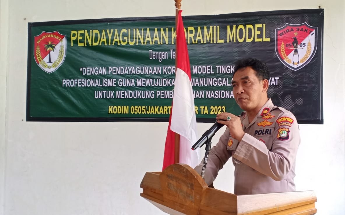 Kodim 0505/Jakarta Timur, Kapolsek Ciracas Kompol M. Budiyono, SH,MM, didampingi Pasi Komsos Korem 051/Wkt Kapten Inf Isgiyanto, Pasi Intel Kapten Inf Sayidan, SE, Pasiter Mayor Inf Nawawi Affandi, Danramil Duren Sawit Kapten Inf Hadi Sasmungi, Danramil 01/Jatinegara Mayor Arh M. Sianturi, Pasi Ops Mayor Inf Agus dan Danramil Pasar Rebo Mayor Chb Asep Setiawan memberikan materi Kepolisian masyarakat pada kegiatan Pendayagunaan Koramil Model Kodim 0505/JT Ta.2023 bertempat di Aula Koramil 03/Pasar Rebo, Senin (19/06/23).