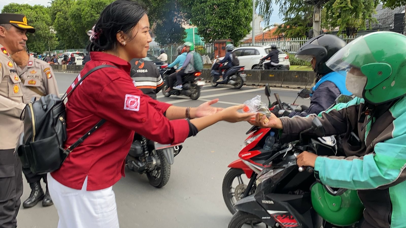 Sebanyak 150 paket takjil dan 150 botol air mineral dibagikan langsung kepada para pengguna jalan, termasuk pengendara dan pejalan kaki yang melintas.