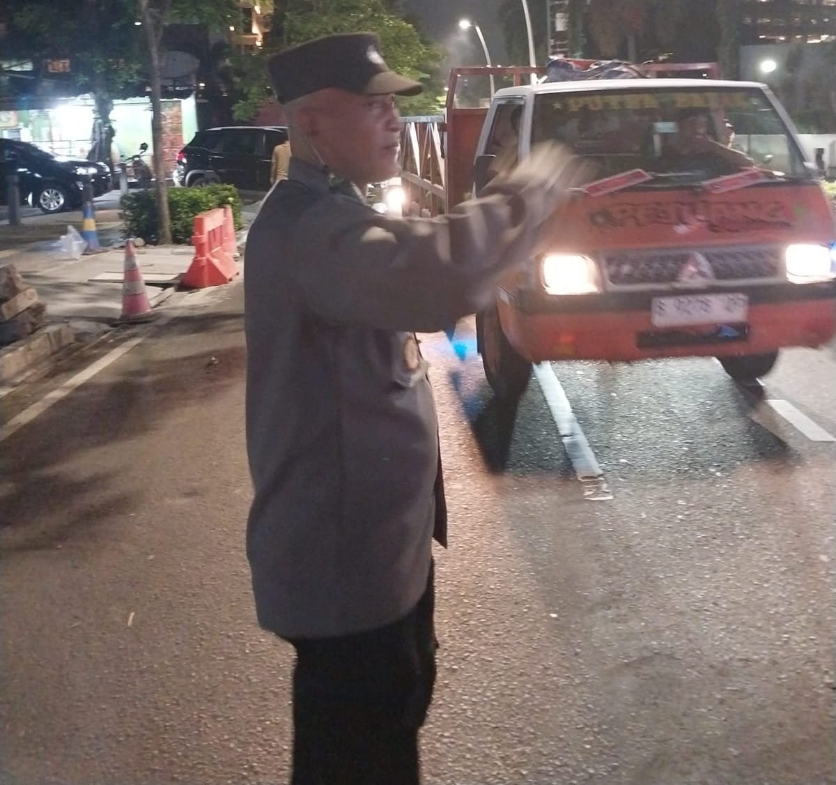 Kapolsubsektor Cikini, Aiptu Joko Hari Purnomo, melaksanakan tugas pengaturan lalu lintas pada malam hari guna mengantisipasi kepadatan kendaraan di sepanjang Jalan Cikini Raya, tepatnya di depan Rumah Makan Ampera. Kepadatan ini terjadi akibat penyempitan jalan yang disebabkan oleh adanya galian proyek pemerintah.