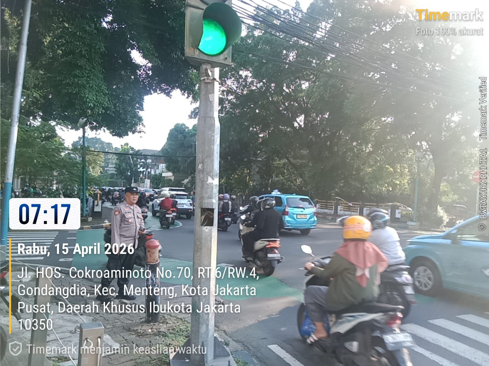 Sejak pagi hari, arus kendaraan di kawasan Jalan HOS Cokroaminoto mengalami peningkatan signifikan. Persimpangan tersebut menjadi salah satu titik strategis yang menghubungkan berbagai jalur utama di wilayah Menteng, sehingga kerap dipadati kendaraan dari arah permukiman, sekolah, hingga pusat perkantoran. Kondisi ini menuntut kehadiran personel kepolisian guna menjaga arus lalu lintas tetap terkendali.