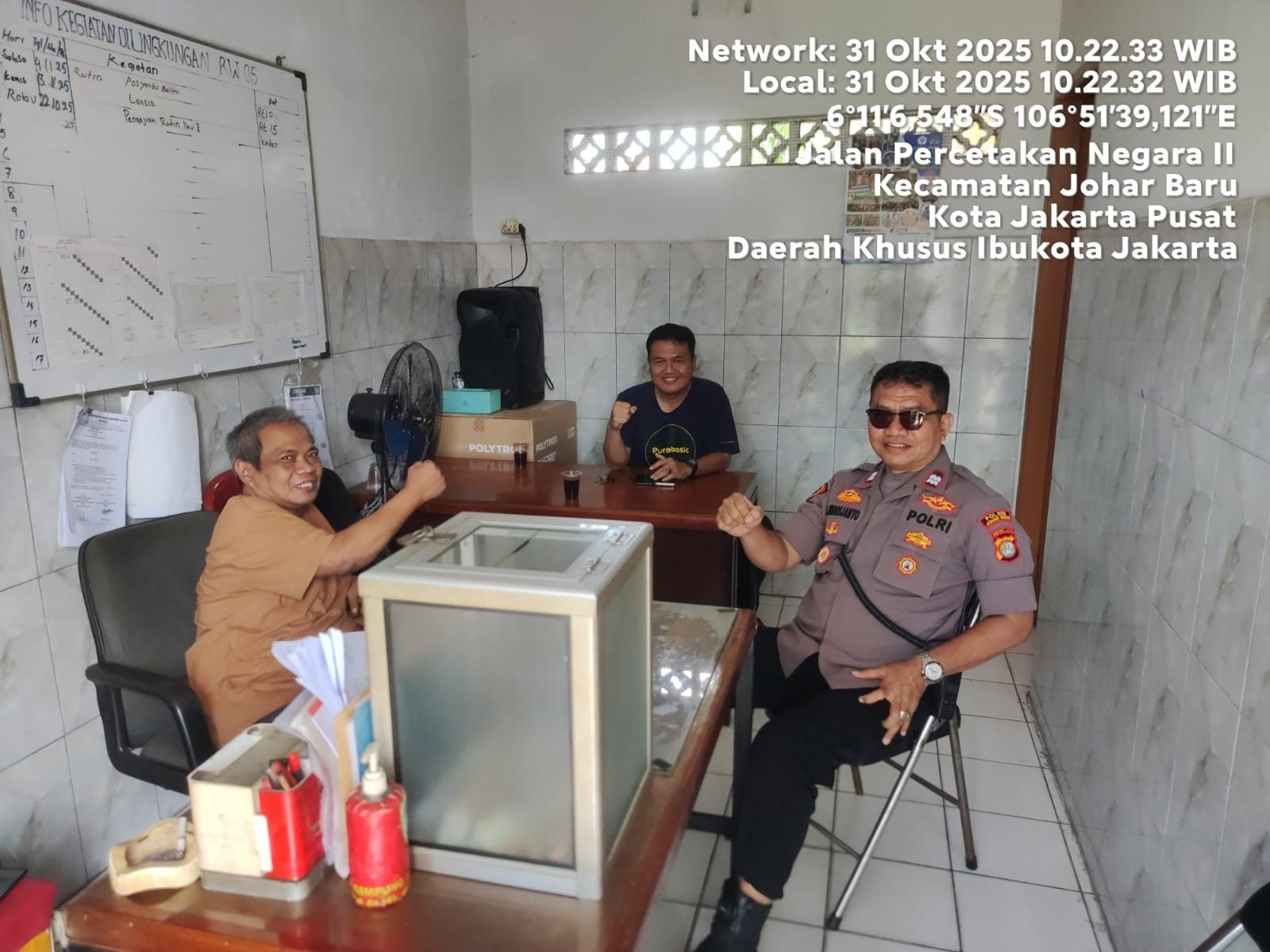 refubliknews.com, || Jakarta Pusat – Dalam rangka menjaga situasi kamtibmas yang aman dan kondusif di wilayah binaan, Kapolsubsektor Kayu Awet Kelurahan Johar Baru Aiptu Lukas Indrijanto melaksanakan kegiatan sambang dialogis di pemukiman warga Jl. Johar Baru 4 RW 05, Kelurahan Johar Baru, Kecamatan Johar Baru, Jakarta Pusat, pada Jumat (31/10/2025) pukul 10.20 WIB.