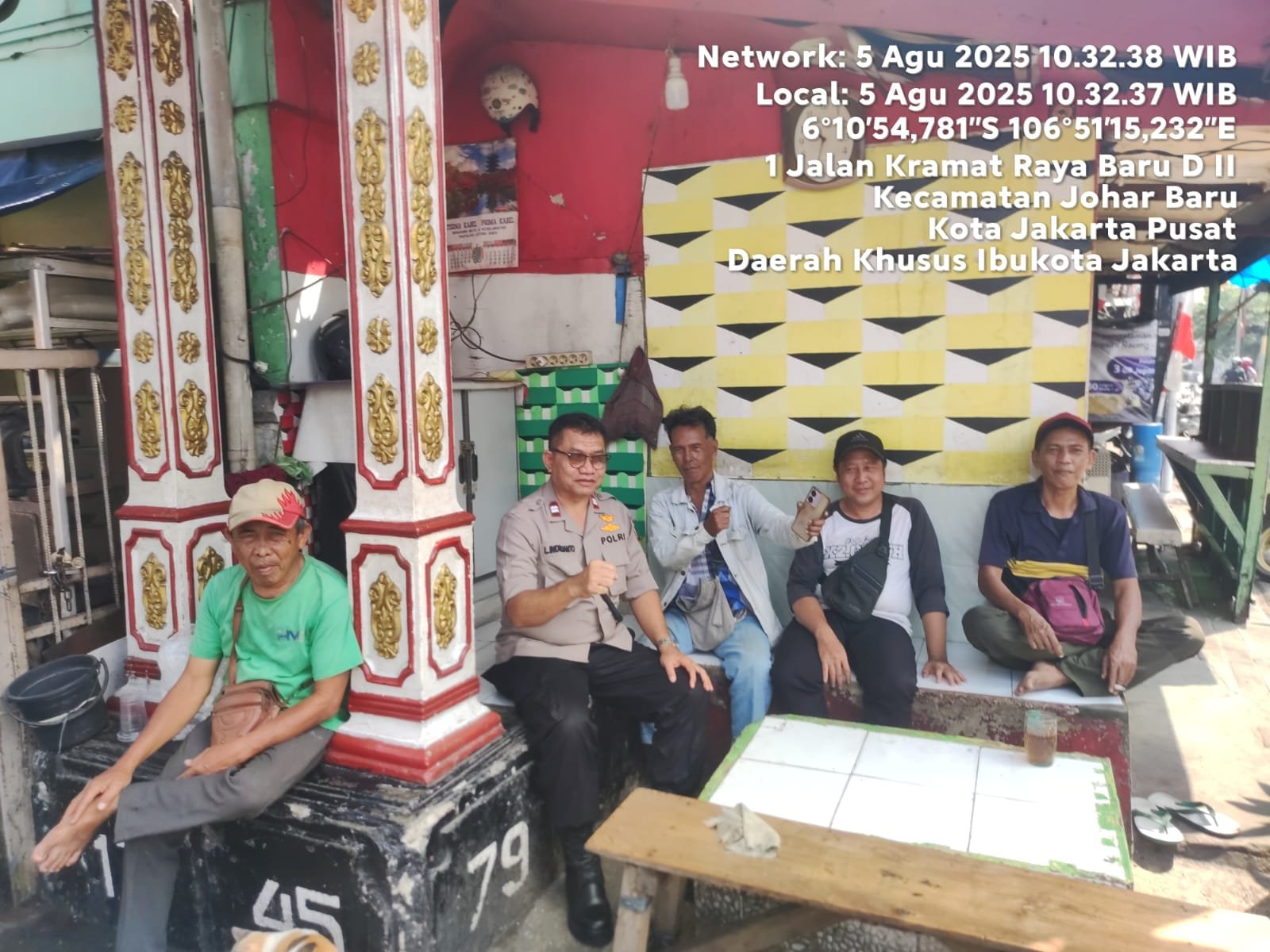refubliknews.com, || Jakarta Pusat – Dalam rangka menjaga stabilitas keamanan dan mempererat hubungan dengan masyarakat, Kapolsubsektor Kayu Awet Kelurahan Johar Baru, Aiptu Lukas Indrijanto, melaksanakan sambang dialogis dan patroli di kawasan pemukiman warga Jl. Kampung Rawa Sawah RT 012 RW 001, Kelurahan Johar Baru, Jakarta Pusat, pada Selasa (5/8/2025) pukul 10.30 WIB.