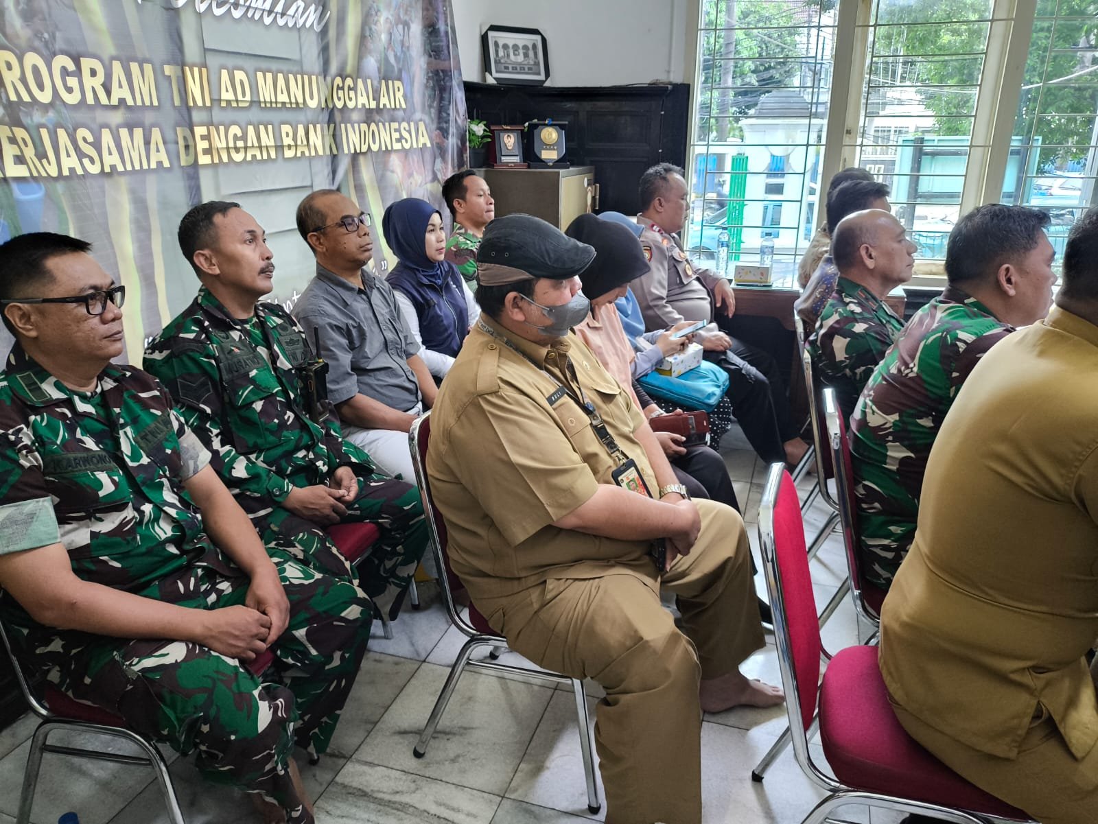 Kepala Divisi Implementasi KEKDA Bank Indonesia Bapak Prasaja Widiatmaka, Kepala Staf Kodim 0501/JP Letkol Inf Dian Aksmiyandita didampingi Danramil 01/Menteng Mayor Inf Ober, Kaurter Lettu Inf Agung dan Muspika Kecamatan Menteng mengikuti peresmian Program TNI AD Manunggal Air Bekerjasama dengan Bank Indonesia TA 2025, bertempat di ruang Sekretariat Masjid Cut Meutia, Jl. Cut Meutia No. 1 Cikini, Menteng Jakarta Pusat, Senin (24/2/2025)