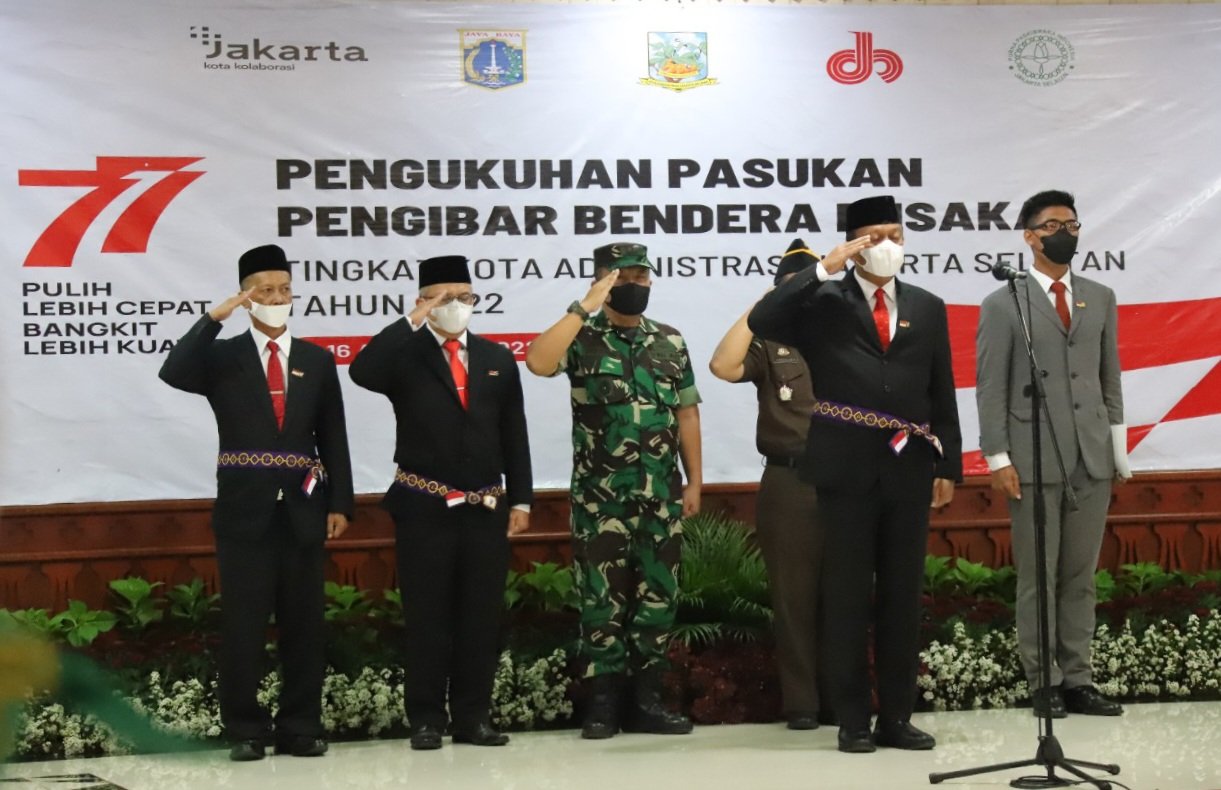 Kodam Jaya, Jaksel – 54 Pasukan Pengibar Bendera (Paskibra) Kota Jakarta Selatan tahun 2022 hari ini Selasa (16/8) dikukuhkan melalui Upacara Pengukuhan yang diselenggarakan di Ruang Pola Kantor Wali Kota Jakarta Selatan.