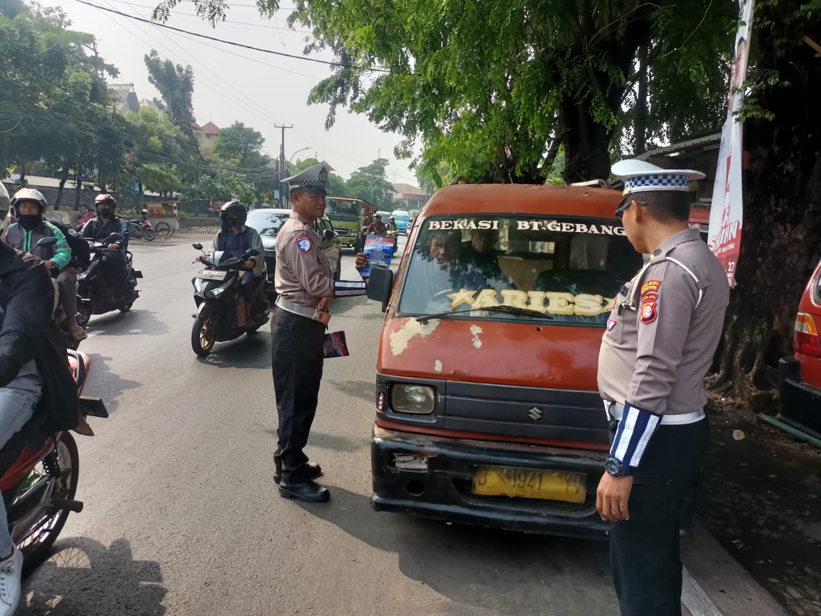 Kegiatan Operasi Zebra Jaya 2024 di Jl. Raya Siliwangi KM 10, Kecamatan Bantar Gebang berjalan dengan lancar, aman, tertib, dan kondusif. Kegiatan dilakukan secara humanis dan berhasil membagikan brosur, membentangkan spanduk, serta memberikan teguran kepada sejumlah pelanggar lalu lintas. (NOER).