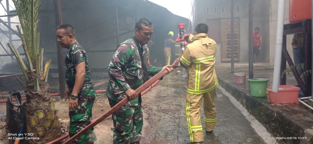 Kutai Kartanegara – Dengan adanya informasi kebakaran di wilayah binaan Babinsa Koramil 0906-01/Tenggarong Kodim 0906/Kutai Kartanegara (KKR) Serma Heri Sutopo bersama warga masyarakat turut membantu petugas pemadam kebakaran dalam memadamkan api yang membakar salah satu rumah warga yang berada di jalan Seluang RT.04 Gg. Karya Kelurahan Timbau Kecamatan Tenggarong, Kabupaten Kutai Kartanegara (Kukar) Kamis (15/2/2024).