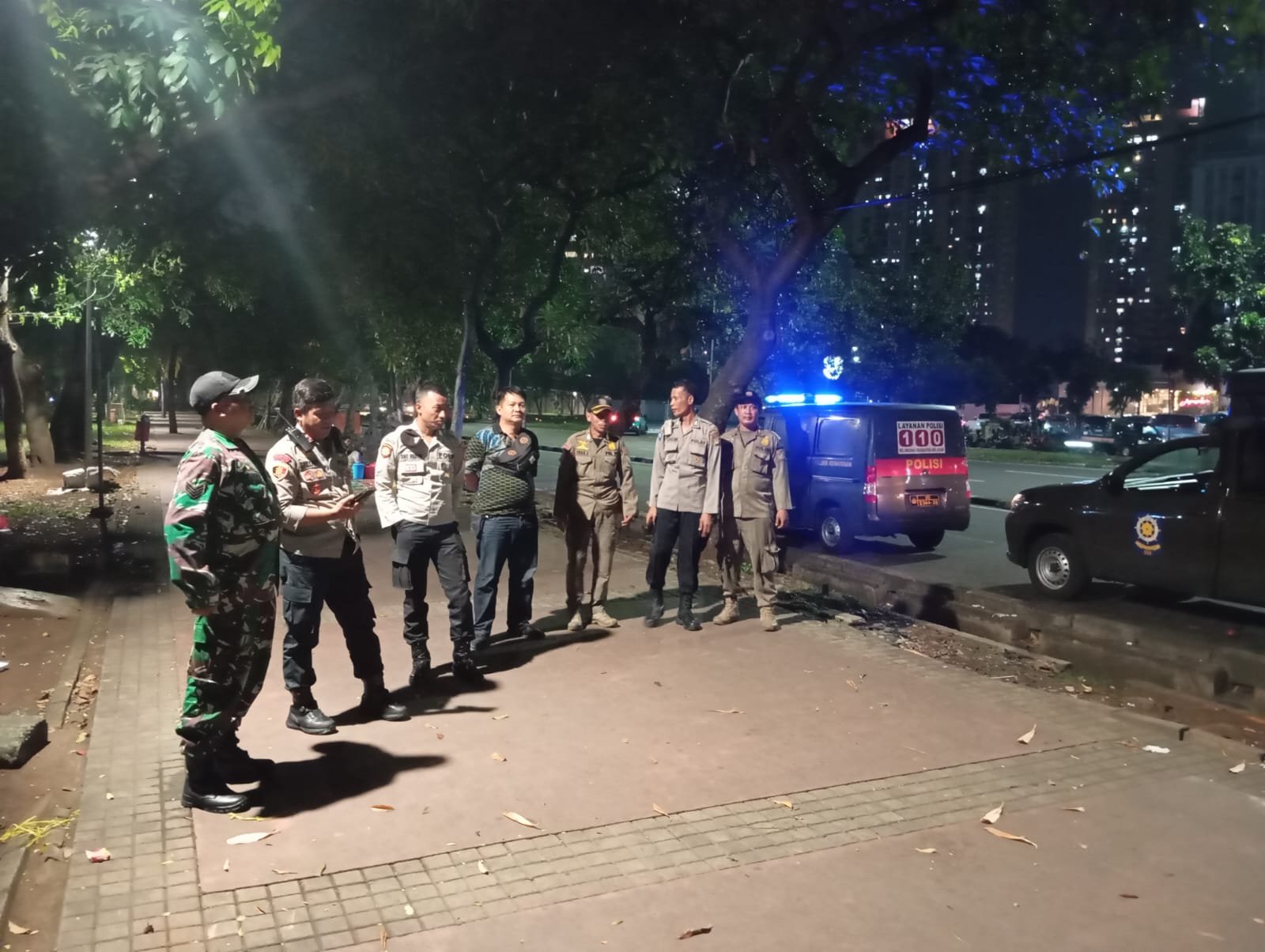 Dipimpin oleh IPDA Sriyadi, SH, delapan personel bergerak dari Mako Polsek Kemayoran pukul 22.55 WIB menyusuri jalur: Jl. Casa – Jl. Dakota Raya – Rusun Tahap 3 – Fly Over HBR Motik – Jl. Benyamin Sueb – hingga Patung Ondel-Ondel.