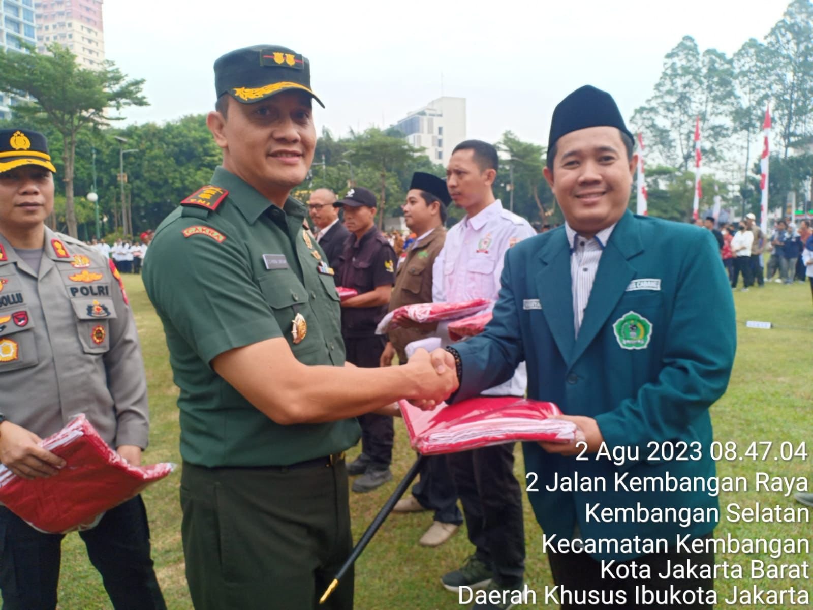Salah satu element masyarakat Dari Organisasi Forum Komunikasi Dai Muda Indonesia ( FKDMI ) jakarta barat menerima bendera merah putih simbolis yang di serahkan langsung oleh Dandim 05/03 Jakarta Barat.