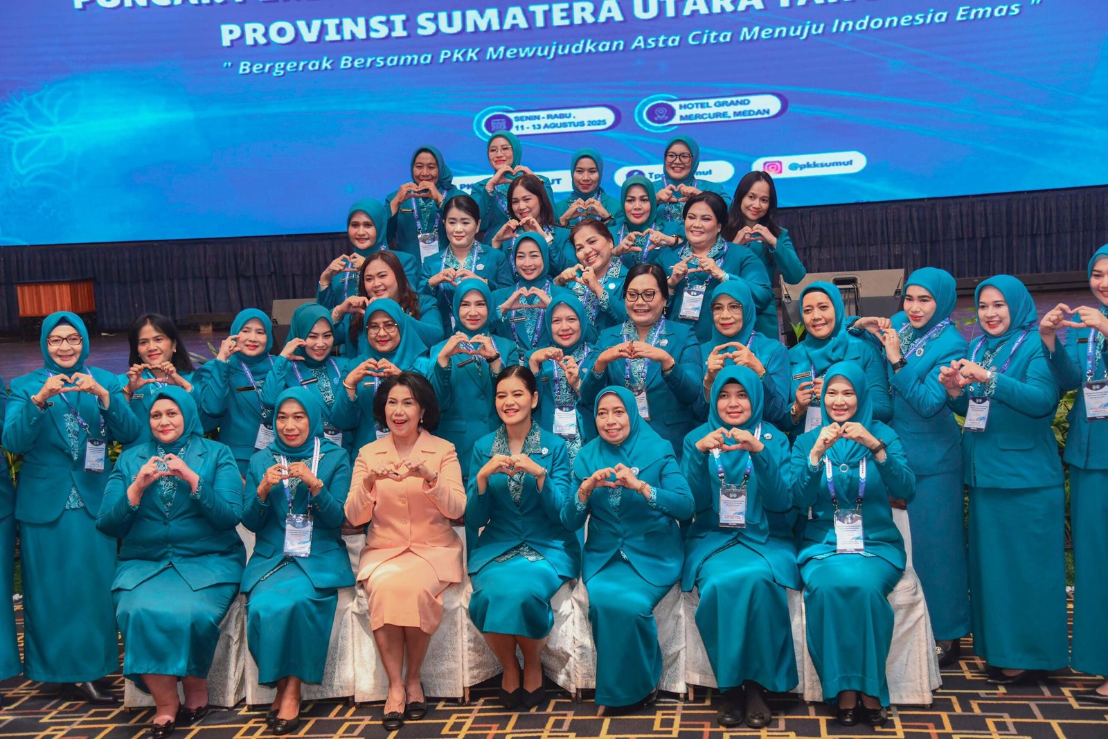 Ketua Tim Penggerak (TP) Pemberdayaan dan Kesejahteraan Keluarga (PKK) Kabupaten Batu Bara Ny. Henny Heridawaty Baharuddin menghadiri acara puncak peringatan Hari Kesatuan Gerak (HKG) ke-53 PKK tingkat Sumut di Ballroom Hotel Grand Mercure, Jalan Sutomo, Medan, Selasa (12/08/2025).