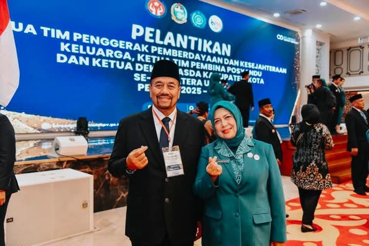 Bupati Batubara Baharuddin Siagian dan Ketua TP PKK abupaten Batu Bara Ny. Henny Heridawaty Baharuddin usai dilantik oleh Ketua TP PKK Sumut Ny. Kahiyang Ayu Bobby Nasution,pelantikan berlangsung di Aula Raja Inal Siregar, Jalan Diponegoro Nomor 30 Medan, Kamis (13/03/2025).Dok. Komimfo Batubara