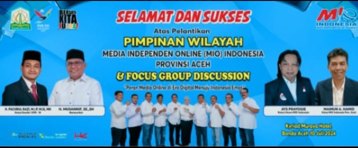 refubliknews.com,- Banda Aceh | Ketua Umum Pimpinan Pusat Media Independen Online (MIO) Indonesia, AYS Prayogie, dijadwalkan melantik pengurus MIO Provinsi Aceh. Acara pelantikan sekaligus dirangkai dengan sebuah pertemuan ilmiah yang digelar di Kyriad Muraya Hotel, Banda Aceh, pada Rabu, 10 Juli 2024.