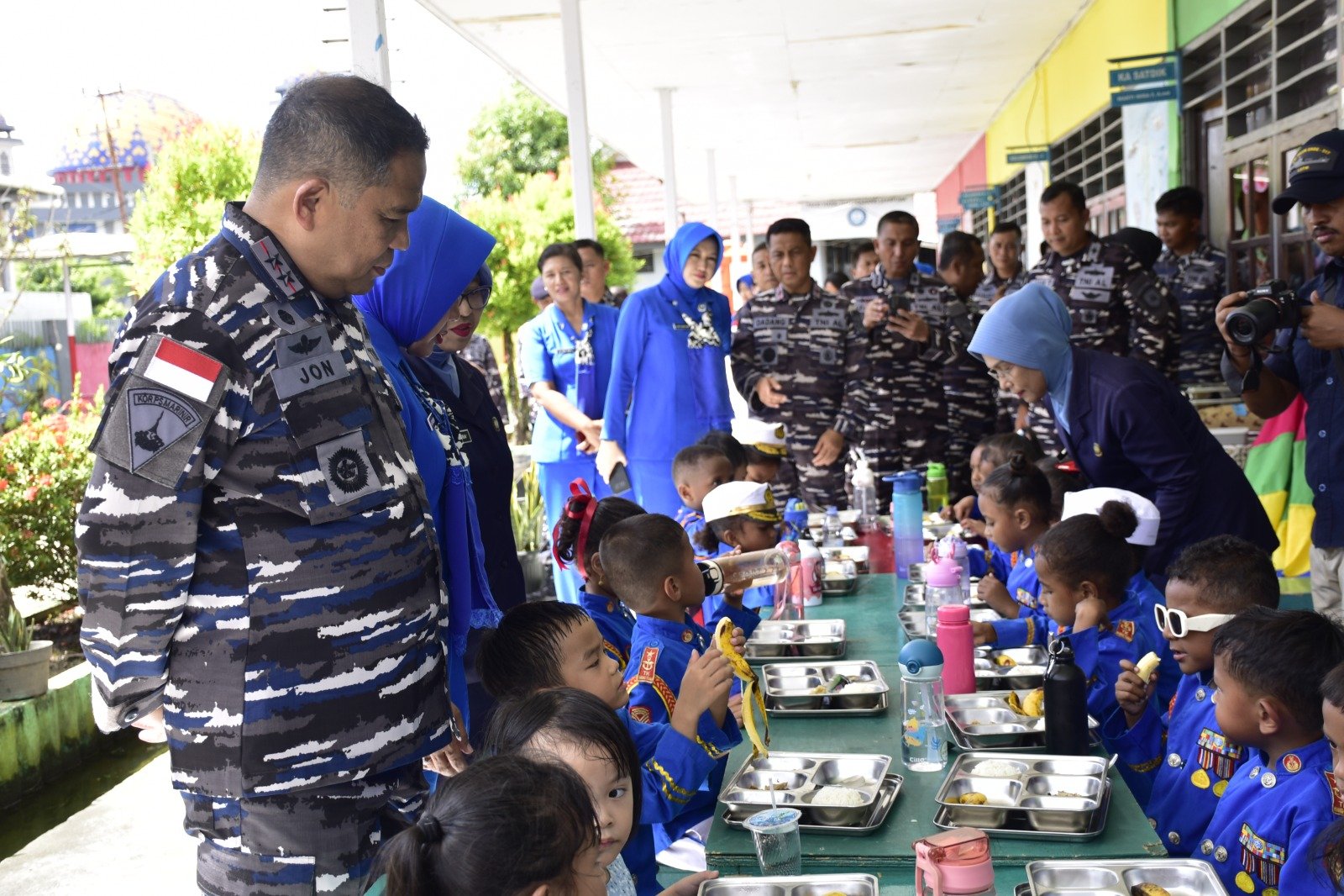 refubliknews.com, || TNI AL, Jayapura, 26 November 2025 – Komandan Komando Daerah Angkatan Laut (Dankodaeral) X Mayjen TNI (Mar) Werijon, M.Han., CIQnR., CIQaR., bersama Ketua Daerah Jalasenastri Kodaeral X Gabungan Jalasenastri Koarmada RI Ny. Chici Werijon, melaksanakan peninjauan Program Makan Bergizi Gratis (MBG) serta menyerahkan hadiah Lomba Mewarnai bagi siswa-siswi TK Hang Tuah Hamadi, Jayapura. Kehadiran keduanya disambut hangat oleh Kepala Sekolah TK Hang Tuah Warti Mira Fatmawati, A.Md., beserta para guru dan anak-anak yang tampak antusias mengikuti rangkaian kegiatan.