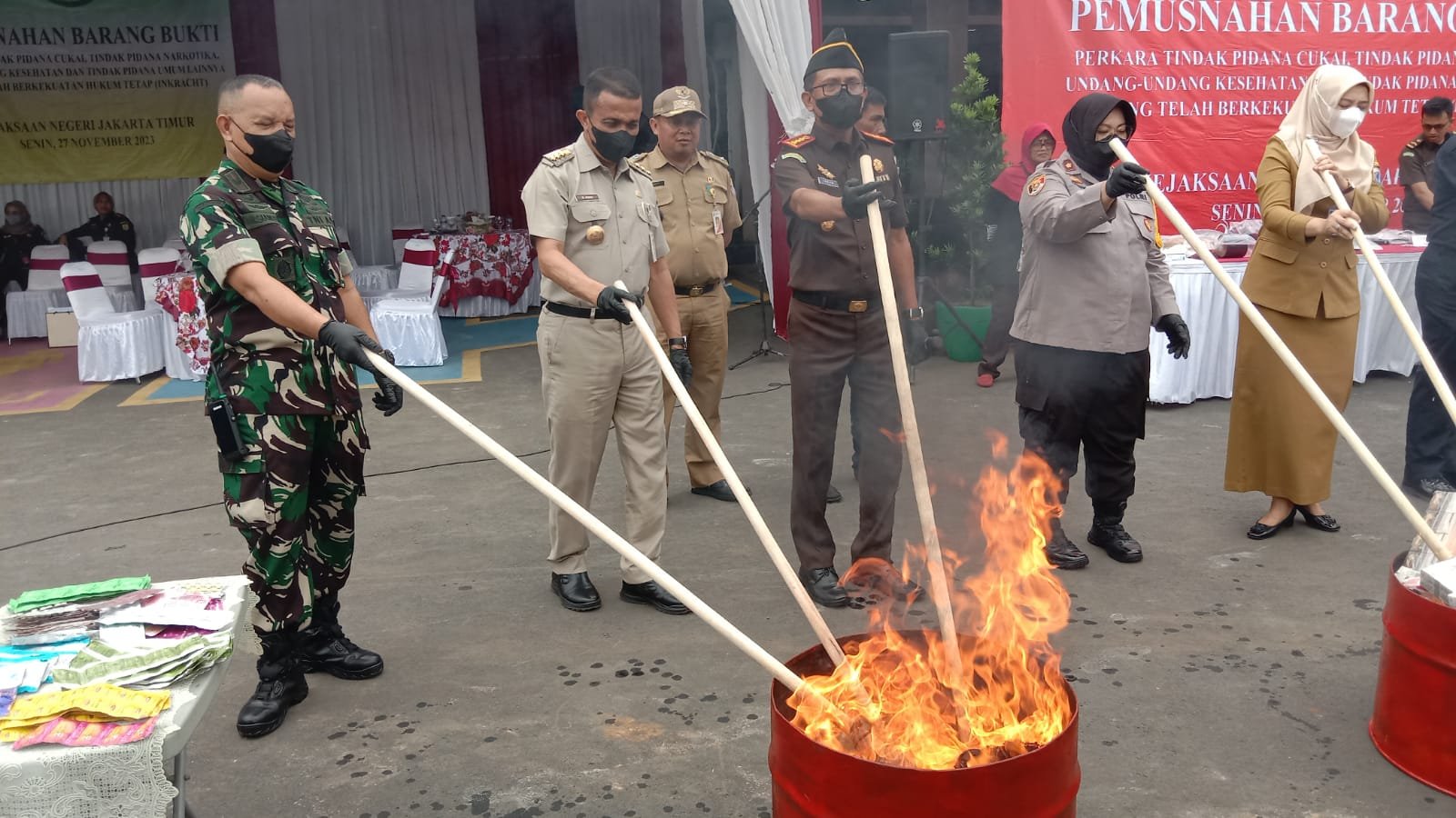 Selanjutnya kegiatan pemusnahan barang bukti secara simbolis secara bersama-sama dengan Kasi Pidsus Kejaksaan Negeri Jakarta timur bersama FORKOPIMKO Jakarta Timur melakukan pemusnahan dengan cara membakar didalam tong yang sudah disediakan dengan menggunakan obor dan dibakar didalam Tong.