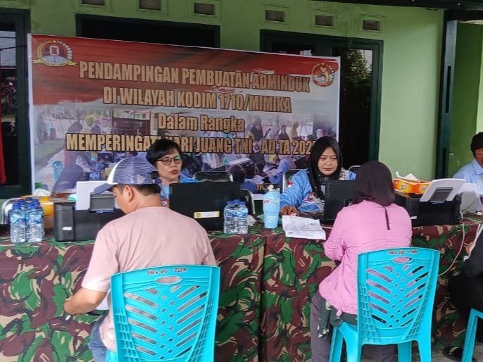 refubliknews.com, || Timika – Dalam rangka memperingati Hari Juang TNI AD, Kodim 1710/Mimika melalui Koramil 1710-02/Timika menggelar kegiatan pendampingan pembuatan administrasi kependudukan (Adminduk) bagi masyarakat, bertempat di Makoramil 1710-02/Timika, Jalan Yos Sudarso, Jumat (5/12/2025).