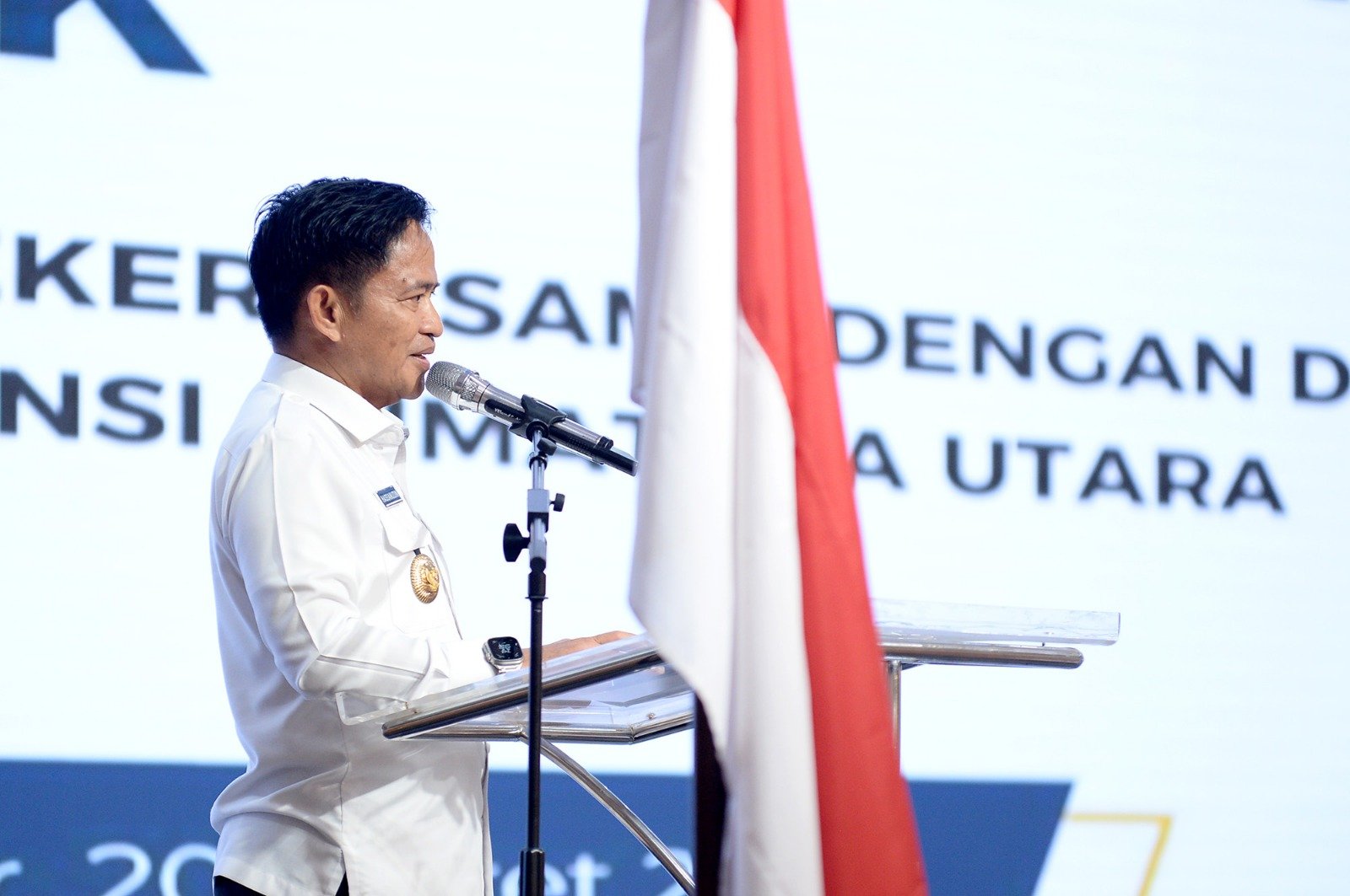 FOTO : Pj Gubernur Sumatera Utara (Sumut) Hassanudin menyampaikan sambutan pada acara Fasilitasi Pengurusan Sertifikat Halal Self Declare kepada 1.000 pelaku Usaha Mikro dan Kecil melalui Dinas Koperasi, Usaha Kecil dan Menengah Provinsi Sumut di Aula Raja Inal Siregar, Kantor Gubernur Sumut Jalan Diponegoro Nomor 30 Medan, Rabu (20/3). Fasilitasi ini terselenggara atas kerjasama dengan Kementerian Koperasi dan Usaha Kecil Menengah Republik Indonesia dalam mewujudkan wajib Halal Oktober 2024.