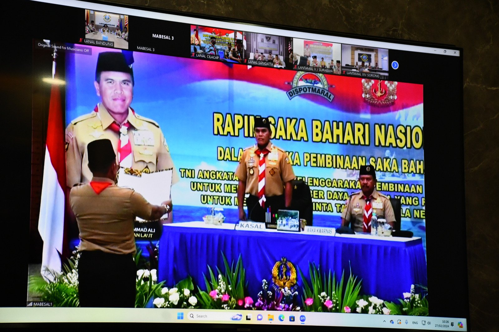TNI AL, Bandung,- Komandan Pangkalan TNI Agkatan Laut (Danlanal) Bandung Kolonel Laut (KH/W) Dr. Renny Setiowati, S.T., M.Sc., M.Tr.Hanla., selaku Mabisaka Bahari Kwarda Jawa Barat menghadiri Rapat Pimpinan (Rapim) Saka Bahari Nasional Tahun 2024 melalui Video Converence (Vicon) yang dipimpin oleh Kepala Staf Angkatan Laut (Kasal) Laksamana TNI Dr. Muhammad Ali, S.E., M.M., M.Tr.Opsla., selaku Ketua Majelis Pembimbing Saka Bahari Nasional, bertempat di Ruang Rapat Mako Lanal Bandung, Jalan Aria Jipang No. 8 Kota Bandung, Selasa (27/02/2024).