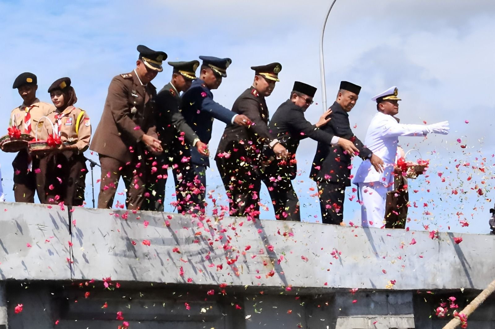 TNI AL, Dumai,- Komandan Lanal Dumai Kolonel Laut (P) Kariady Bangun, memimpin Upacara Tabur Bunga dalam rangka memperingati Hari Pahlawan Tahun 2023 yang diikuti oleh Anggota Forkopimda Provinsi Riau dan Kota Dumai. Kegiatan dilaksanakan di Dermaga TNI AL Bangsal Aceh Dumai, Jalan Sidodadi, Kelurahan Bangsal Aceh, Kecamatan Sungai Sembilan, Kota Dumai, Jum’at (10/11/2023).