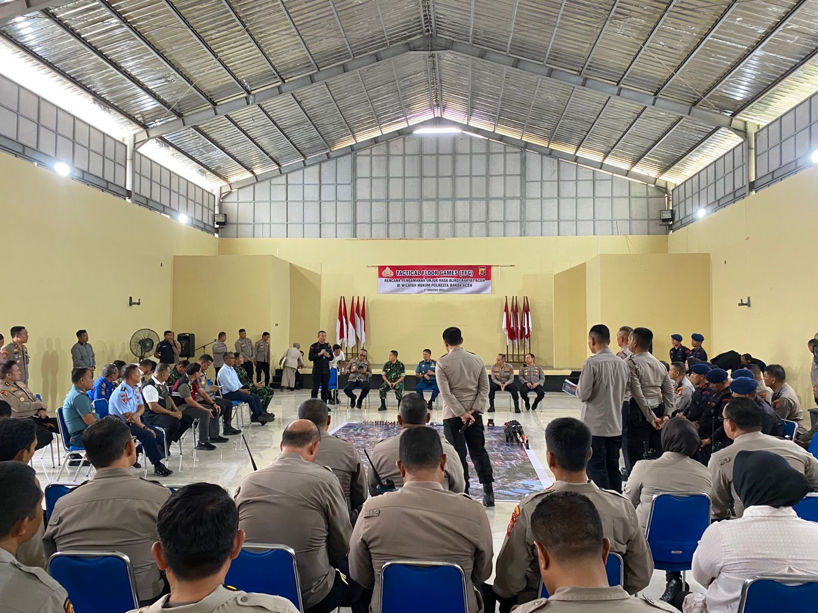 refubliknews.com, || TNI AL, Sabang,- Dalam rangka menghadapi aksi unjuk rasa di Kota Banda Aceh, Polresta Banda Aceh menggelar TFG (Tactical Floor Game) dan Latihan Sistem Pengamanan Kota (Sispamkota) yang dihadiri Komandan Lanal Sabang Kolonel Laut (P) Sadimin, S.E.,M.Tr. Opsla., bertempat di Polresta Banda Aceh, Kp. Baru, Kecamatan Baiturrahman, Kota Banda Aceh, Minggu (31/8/2025).