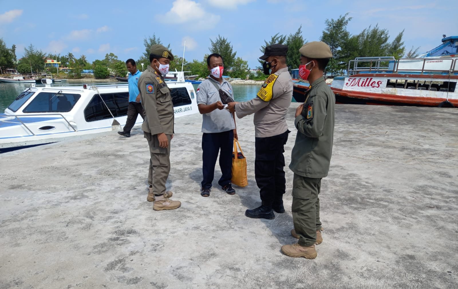 Pembagian masker gratis dilakukan oleh personil Polres Kepulauan Seribu dan Polsek jajaran yang sedang memberikan pelayanan pengamanan dermaga serta patroli jalan kaki di sekitar wilayah pemukiman penduduk.