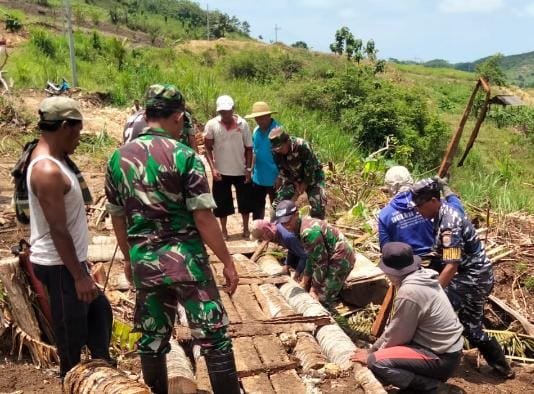 Dengan penuh semangat anggota Koramil 0808/17 Bakung Kodim 0808/Blitar dan warga masyarakat melaksanakan kegiatan kerja bakti bersama membangun jalan alternatif jurusan ke Pantai Pasur, di Desa Bululawang Kec. Bakung Kabupaten Blitar, Kamis (12/01/2023).