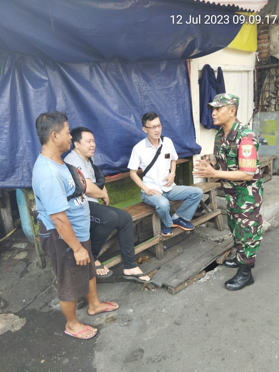 Kodam Jaya Jakarta – Pererat silaturahmi dan kedekatan dengan warga binaan anggota koramil 02/TB, Kodim 0503/JB, Babinsa Kel.Tambora Serma Sinaga melaksanakan Komsos dengan Feri, Indra(ekspedisi) dan Leman selaku penjual air