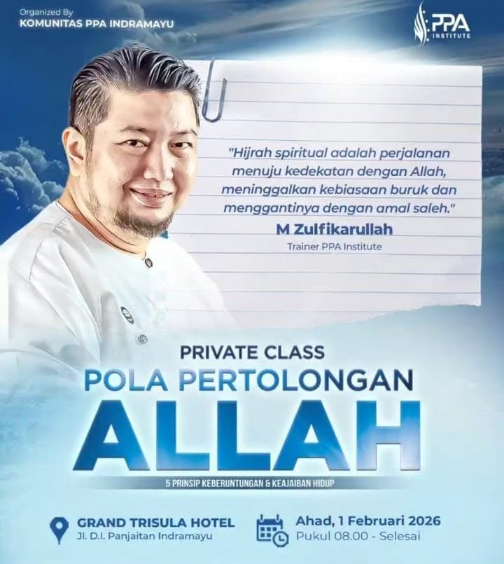 detikhukum.id,- Indramayu, – Komunitas Pola Pertolongan Allah (PPA) Cabang Indramayu menggelar acara Private Class PPA Institute dengan Tema ” 5 Prinsip Keberuntungan dan Keajaiban Hidup” berjalan lancar dan sukses yang diselenggarakan di Aula Hotel Trisula Jl. Di Panjaitan No.77, Karanganyar, Kec. Indramayu, Kabupaten Indramayu, Minggu ( 01/02/2026).