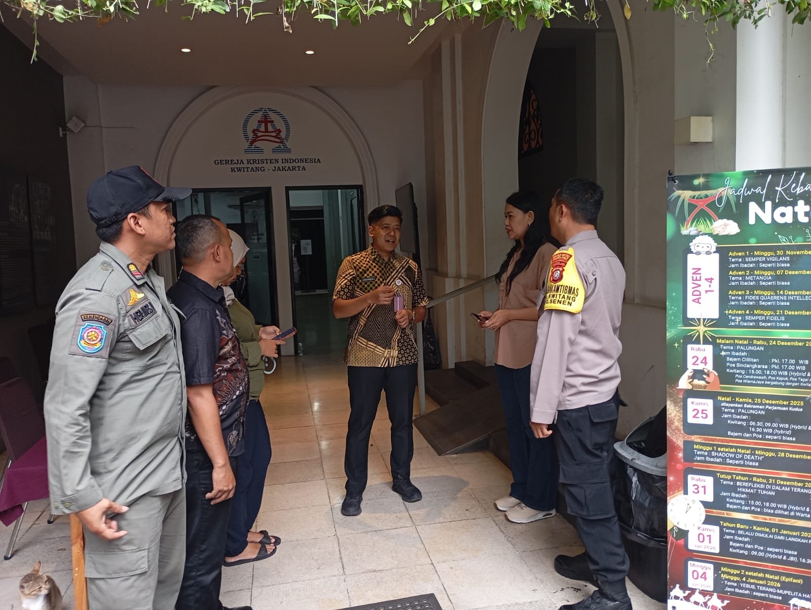 Kegiatan tersebut dilaksanakan pada Kamis (18/12/2025) di kawasan Jalan Kwitang Raya, Kelurahan Kwitang. Bhabinkamtibmas Kwitang Aipda Samsudin bersama Kasi Pemerintahan Kelurahan Kwitang Akmal, unsur Pol PP Kwitang Hermes, Ketua RT setempat Ibu Nung, serta staf kelurahan melaksanakan sambang dan koordinasi langsung ke Gereja GKI Kwitang.