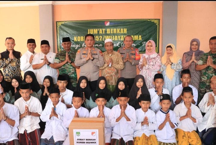 Sementara itu Mayor Kav Bakir Pasi Bhakti TNI Sterrem 052/Wkr, mewakili Danrem 052/Wkr mengatakan, Alhamdulillah adik-adik yatim putra dan putri semoga diberikan kesehatan oleh Allah subhanahu wa ta’ala amin yang pertama tama marilah kita ucapkan puji dan syukur kehadirat Allah subhanahu wa taala atas rahmat dan karunianya bahwa sore hari ini kita bersyukur dapat berkumpul di tempat yang indah ini dalam rangka melaksanakan Jumat berkah Korem 052/Wkr dalam keadaan sehat wal afiat. Bapak Ibu sekalian mohon izin mohon maaf Bapak Komandan Korem 052/Wkr dalam hal ini tidak dapat hadir,” terangnya.