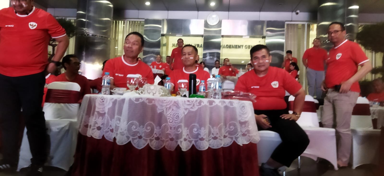 Sementara Kakorlantas Polri Irjen Aan Suhanan ikut langsung dalam acara nobar tersebut. Dirinya mengenakan jersey Timnas Indonesia. Selain itu, turut hadir pejabat utama Korlantas Polri.