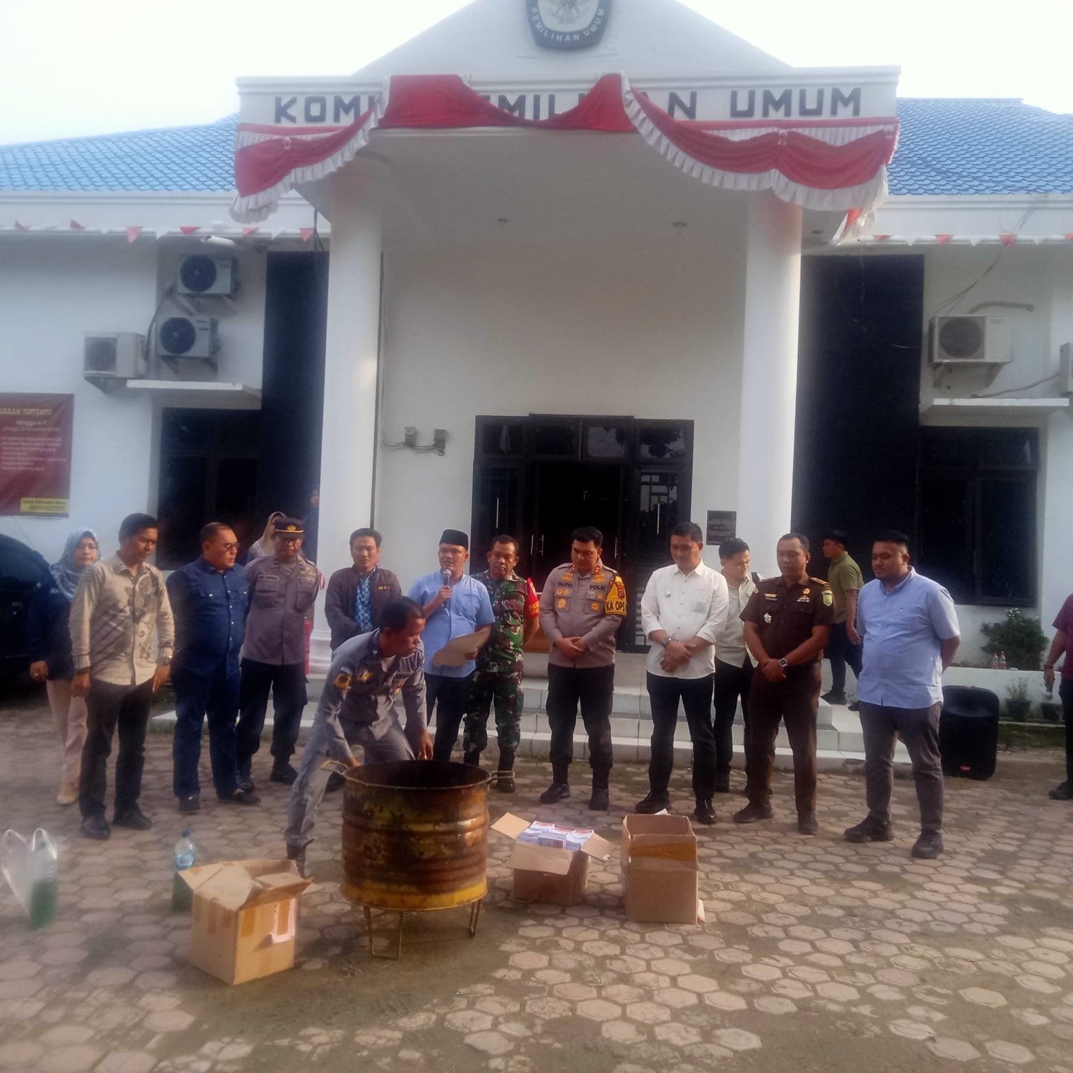 MUSNAHKAN: Ketua KPU batubara Erwin, Ketua Bawaslu Batubara M Amin, Pj. Bupati Batubara Heri Wahyudi, Kapolres Batubara AKBP Taufik Hidayat Tyaheb dan Unsur Forkompinda saat musnahkan surat suara yang rusak Selasa(26/11) di Halaman Kantor KPU Batubara.