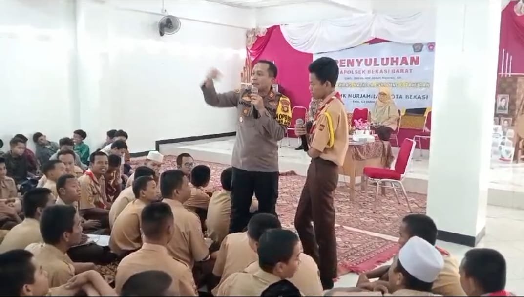 AKP Anton Sujarwo, SH., Kapolsek Bekasi Barat menyampaikan materi tentang bahaya narkoba, kenakalan remaja dan tawuran, serta dialog interaktif dengan siswa bagaimana cara mencegah peredaran narkoba dan menjelaskan apabila ikut tawuran sangsi hukum, pasal-pasal yang dapat menjerat pelaku tawuran.