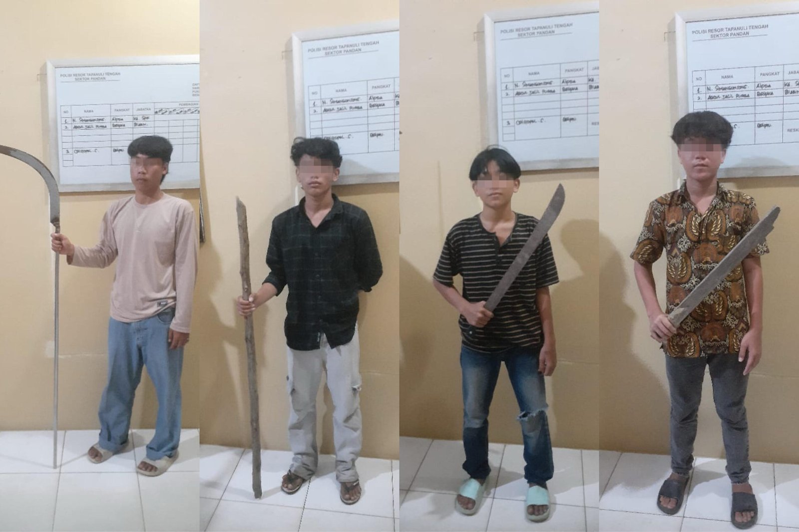 Kapolres Tapanuli Tengah AKBP Wahyu Endrajaya, SIK, M.Si melalui Kapolsek Pandan menjelaskan bahwa dari para remaja tersebut, Polisi berhasil menyita barang bukti senjat* taj*m yakni sebilah celurit pendek, sebilah celurit bergagang besi, sebilah parang dan sepotong kayu broti serta sepotong kayu bulat.