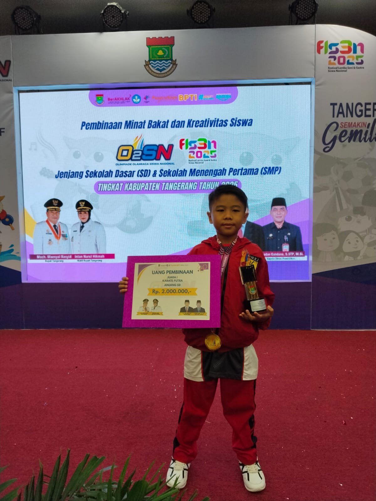 Lakkhi Pannavanta Sila Tanjaya, siswa SD Lentera Harapan Panongan, menjadi juara 1 dalam O2SN Karate tingkat Kabupaten Tangerang dan berhak mendapatkan: