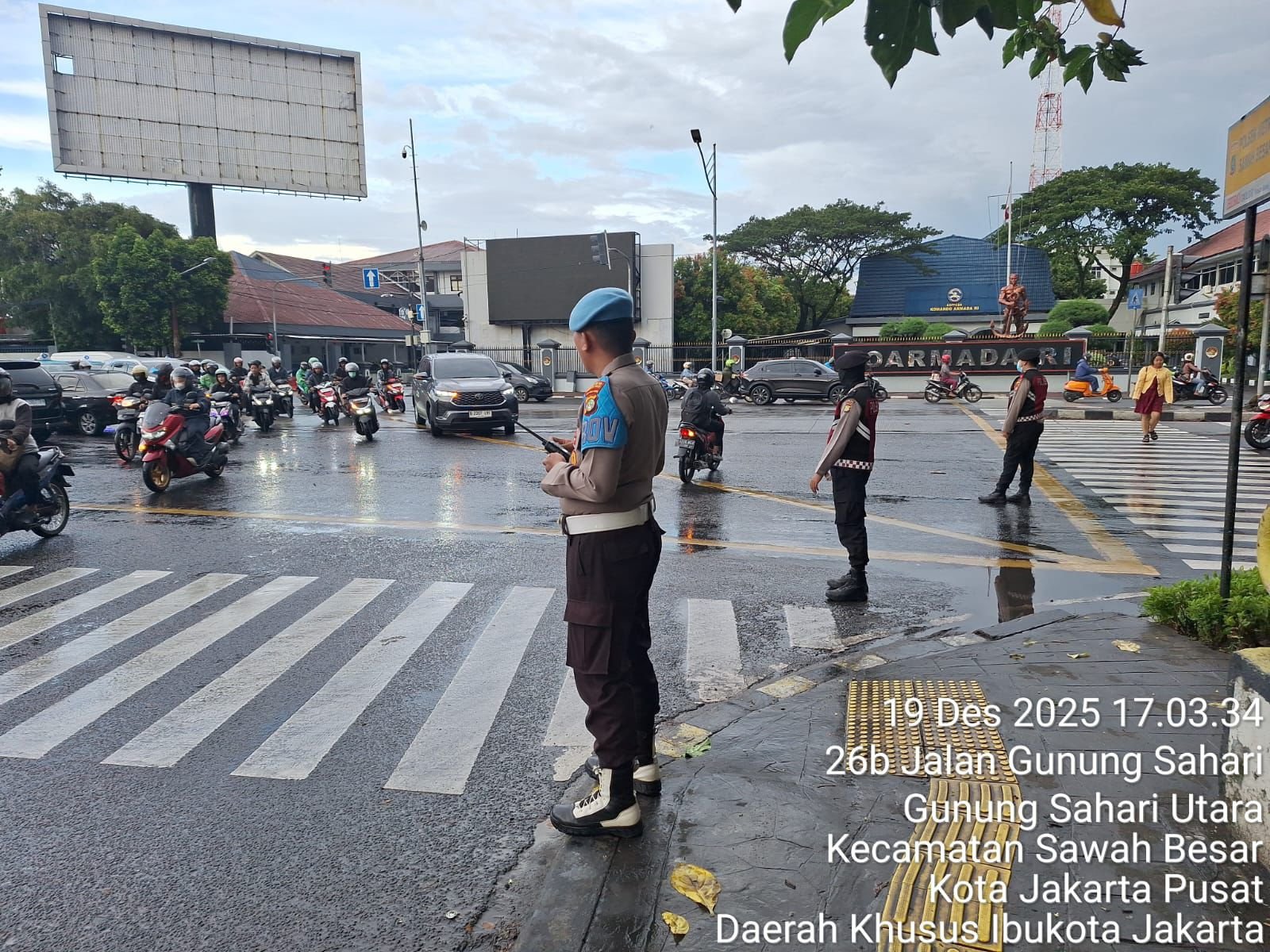 Jakarta Pusat — Dalam cuaca hujan rintik rintik Polsek Sawah Besar menggelar pelayanan publik progresif di sejumlah titik rawan kemacetan, Jumat sore (19/12/2025). Kegiatan ini dilaksanakan sejak pukul 16.00 hingga selesai sebagai upaya pencegahan kecelakaan lalu lintas sekaligus memastikan kelancaran mobilitas warga pengguna jalan yang pulang kerja, Pelayanan dan pencegahan tersebut dipimpin oleh Kanit Patroli Polsek Sawah Besar, Iptu Syafrizal, bersama Aiptu Anwarudin, dan 5 personil lainya di bantu oleh 6 personil Satlantas Polda Metro Jaya.